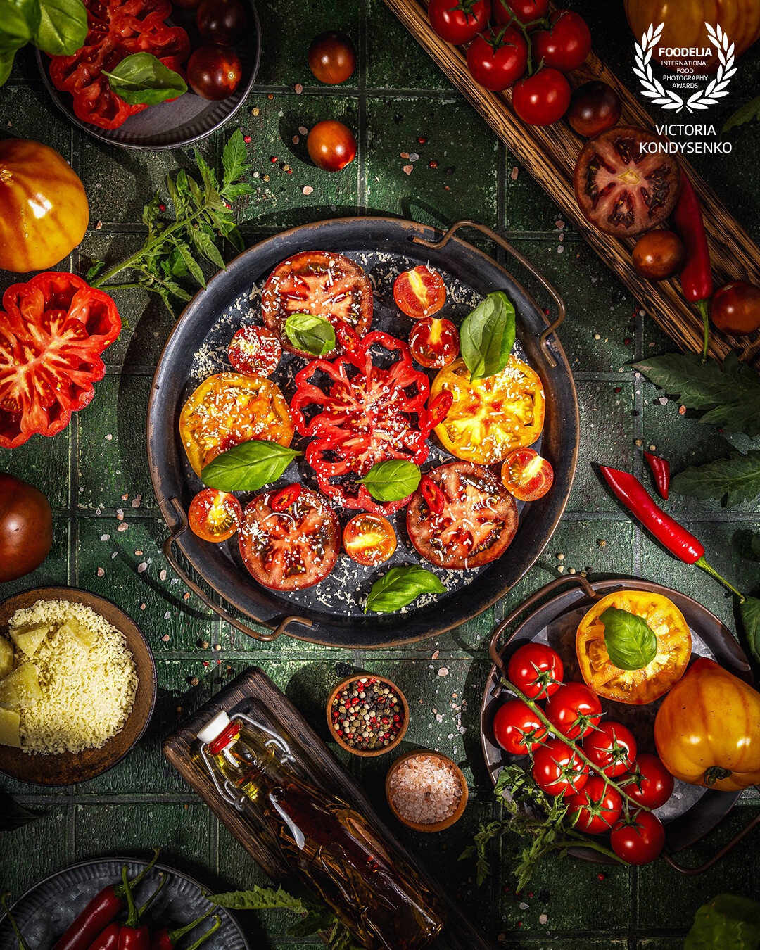 Vibrant culinary scene. Sliced organic tomatoes in various colors and sizes arranged on a dark rustic plate, garnished with grated cheese, basil, and chili peppers.