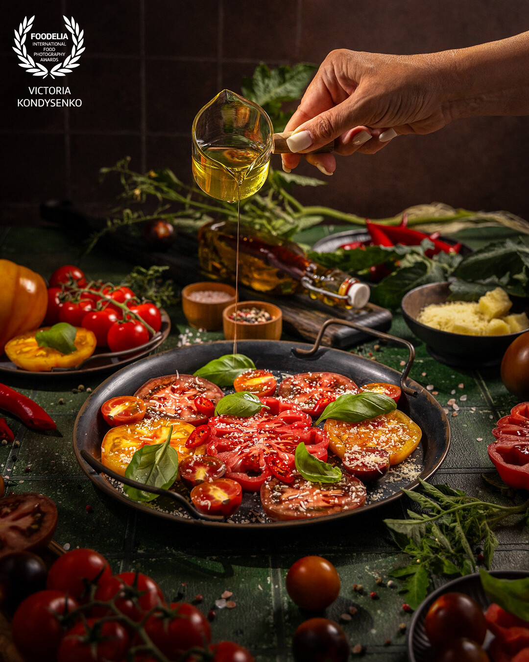 Hand pouring golden olive oil from a glass measuring cup over sliced heirloom tomatoes with fresh basil and grated parmesan for a rustic, fresh salad or appetizer