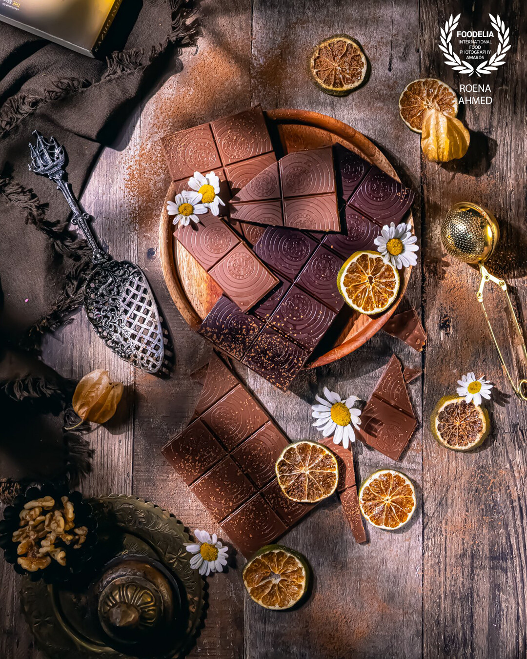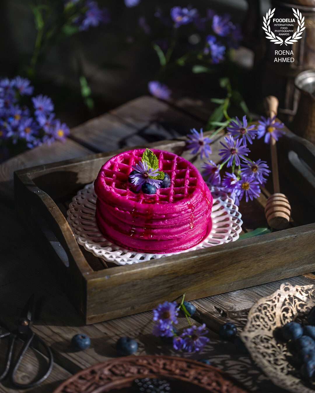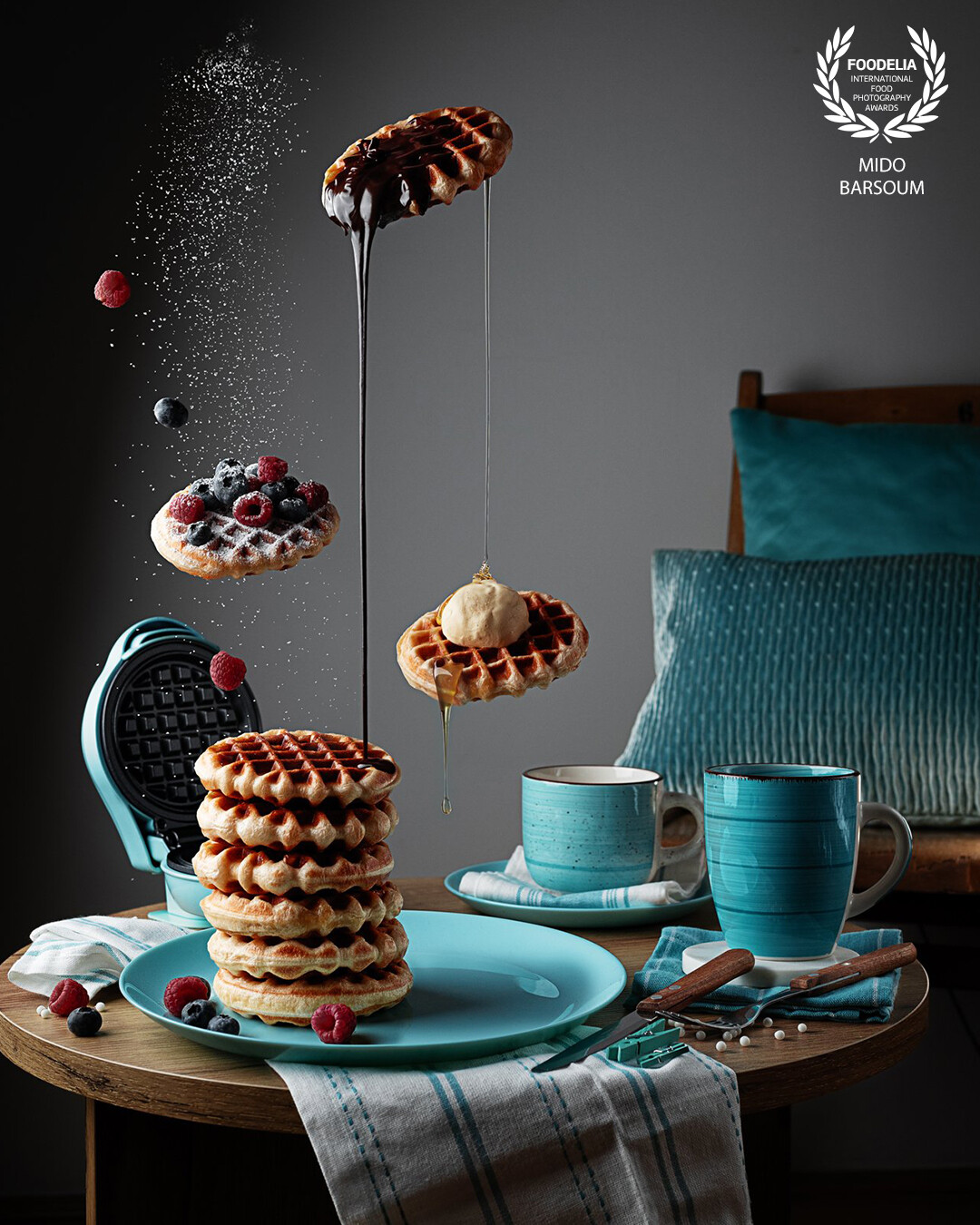 This was a very fun project and probably the only time I made such an elaborate shoot outside my home studio. I was in my apartment in Budapest at the time and I wanted to try and setup a small space in my tiny bedroom to shoot this. I only had my speed-light with me. I bought a tripod and a softbox and created a little shooting-corner. It was a full day shoot and I accidentally bumped the camera while I was shooting, so I had to start over about quarter- way into the shoot, as the plan was to composite multiple images to achieve the floating waffles effect.