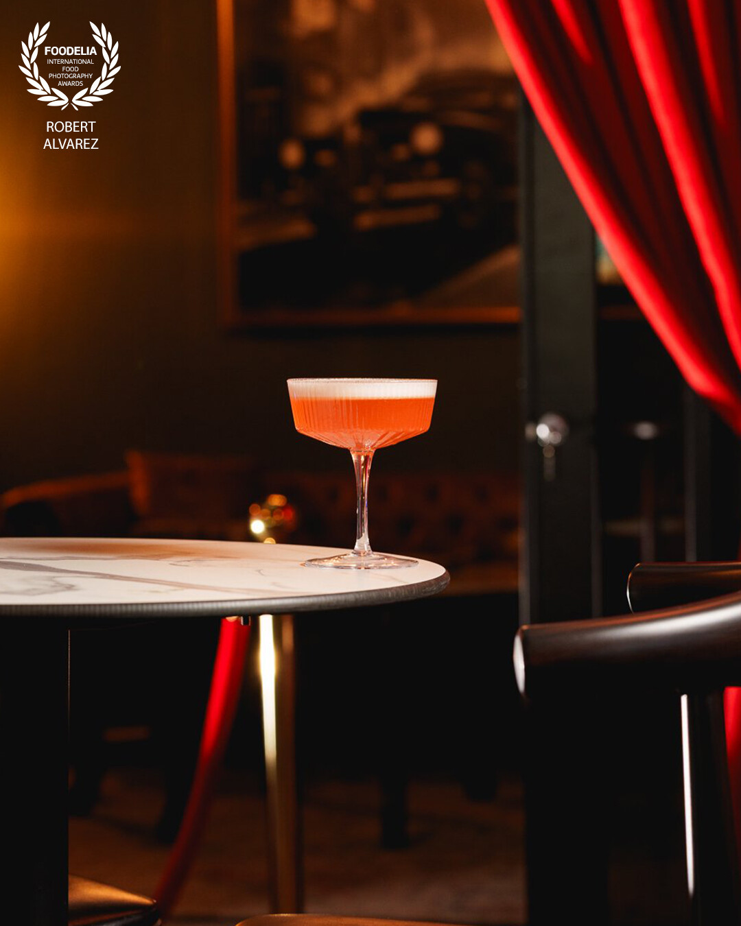 This photo, taken at Vagabundo Social in San Juan, captures a cocktail as the centerpiece of the frame, glowing under warm, focused light. The marble table and deep red curtain in the background add an elegant cinematic feel, balancing intimacy with sophistication. By stepping back from the close-up approach, the composition allows the drink to breathe within its environment, highlighting not just the cocktail but the ambiance of the space itself—moody, refined, and inviting.