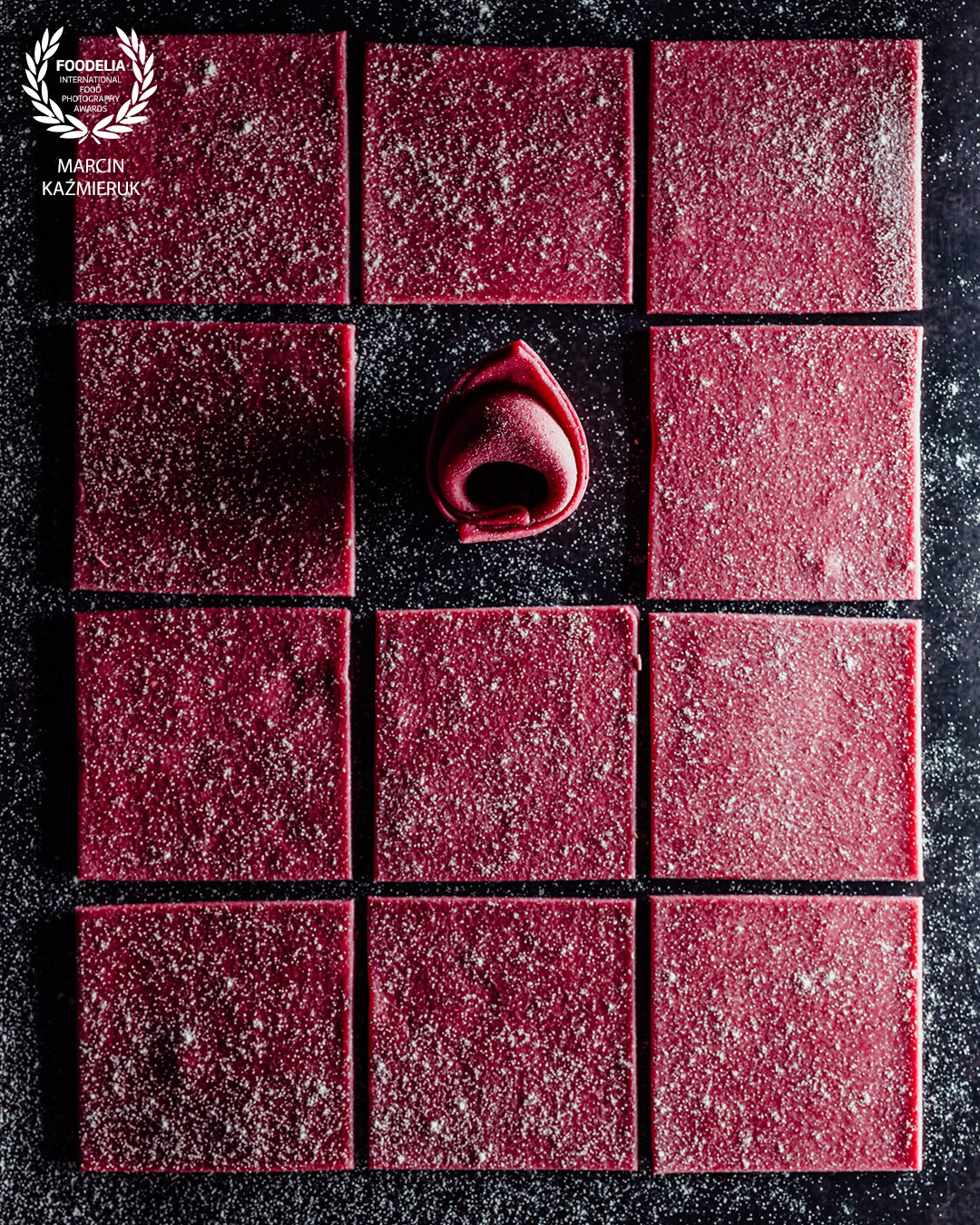 Red tortellini stuffed with ricotta, spinach and parmesan.