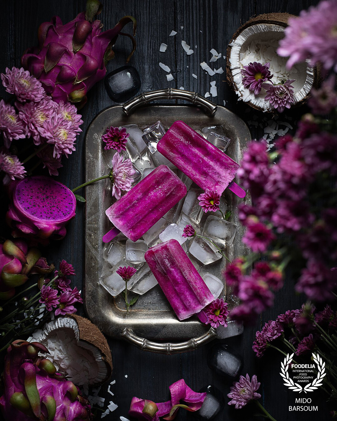 Yet another one of my entries into the Food Art Project challenges on Instagram. The theme was popsicles and I decided to use dragon fruit for its vibrant color. I added coconut milk, to offset the amount of pink and create a gradient/hombre effect on the popsicles. It was particularly hard to find the wooden popsicle sticks in the same shade as the dragonfruit, but I think they were one of the key props that made this image more special.