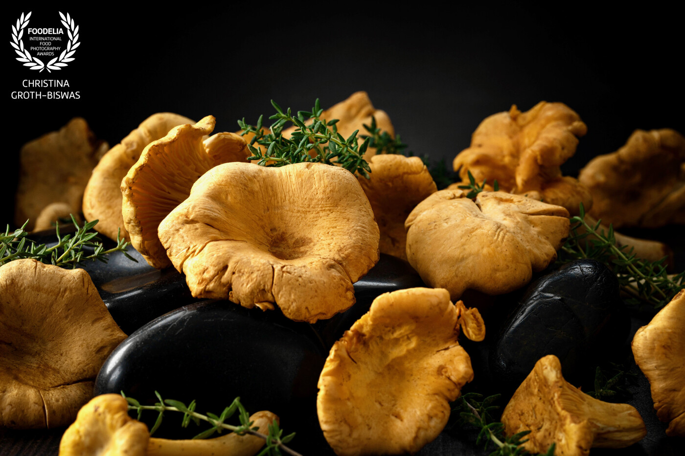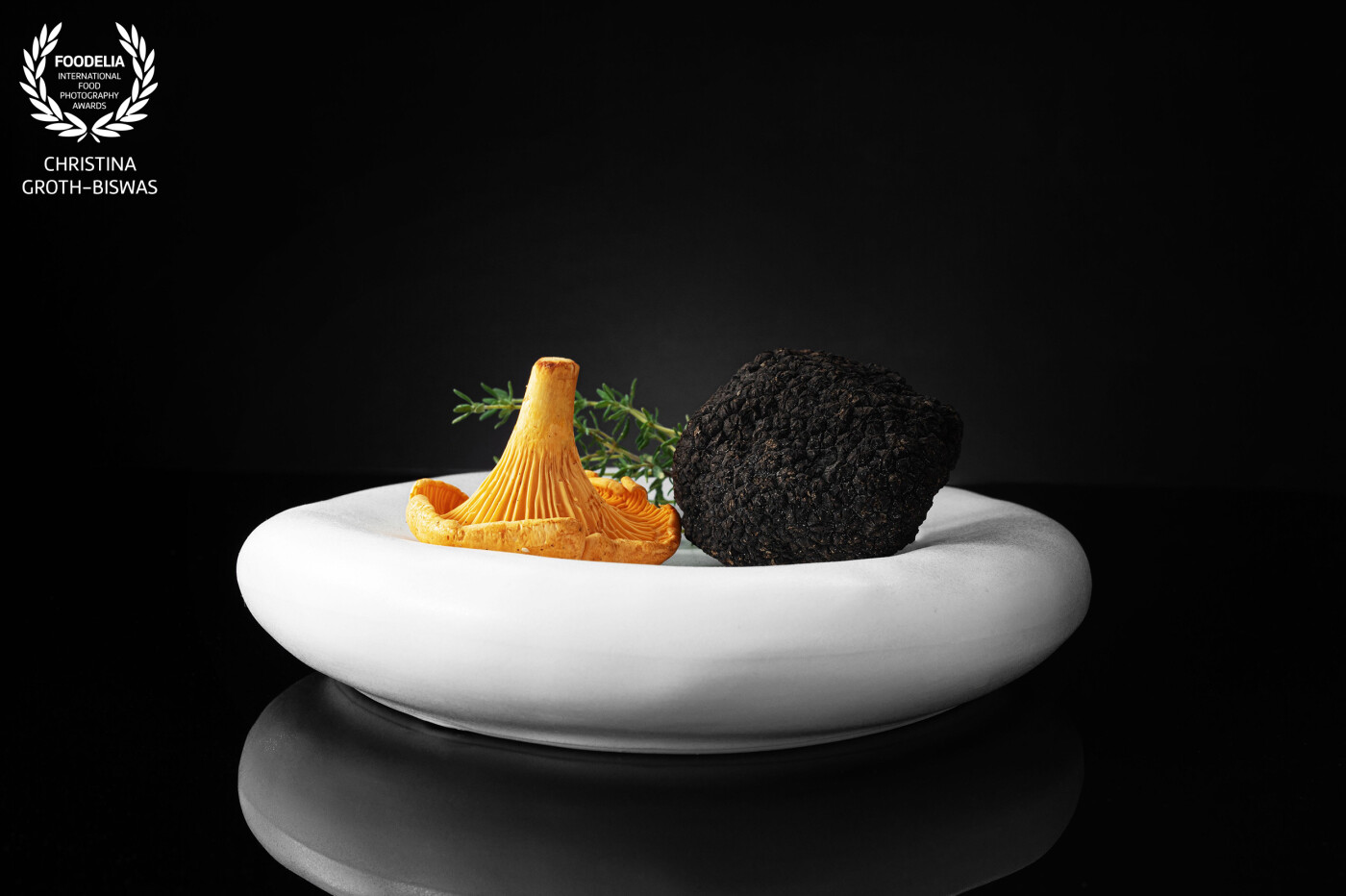 A black truffle and a seasonal golden chanterelle, placed together in my signature minimal composition. I wanted to highlight the contrast of their textures โ the rough, earthy truffle against the delicate, sculptural folds of the mushroom.