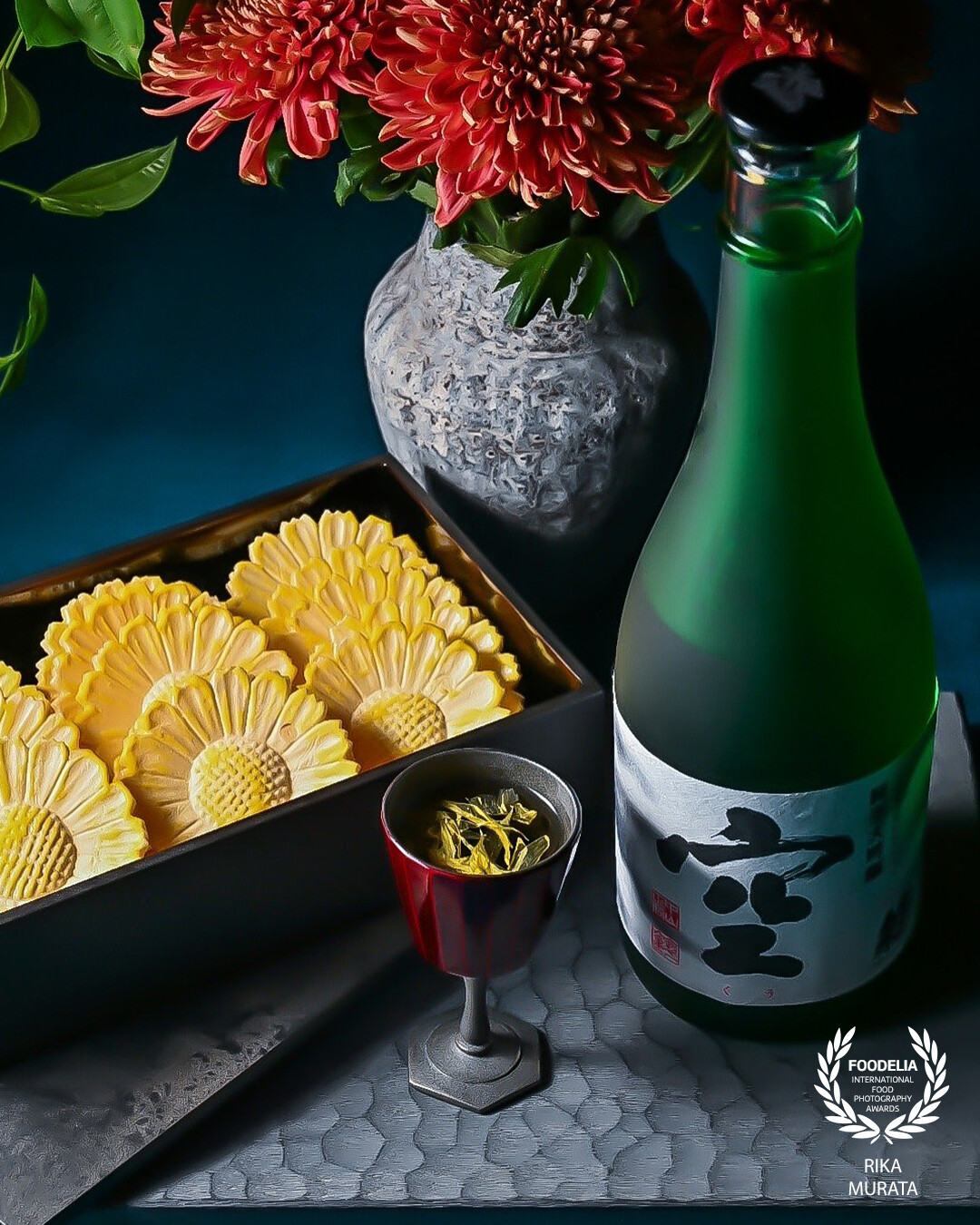 This is a styling of the Japanese festival "Choyo no Sekku." Choyo no Sekku is an event held every year on September 9th to pray for the health of family members, the prosperity of descendants, and eternal youth and longevity. Kikuzake (chrysanthemum sake) Chrysanthemum flowers are soaked in or floated in sake, and the sake that has absorbed the fragrance is drunk to ward off evil spirits and pray for longevity.