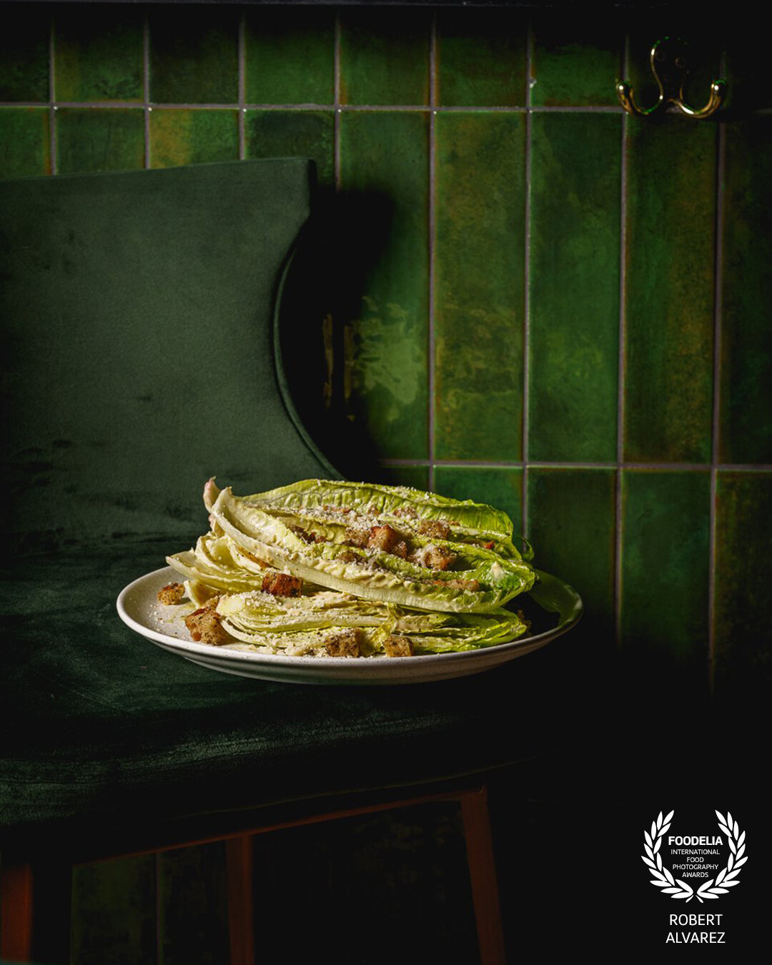 This image stands out for its monochrome green palette, where the tiles, velvet chair, and romaine all echo the same tonal family, creating a calm, cohesive visual mood. The lighting is soft and directional, shaping gentle shadows that add depth while keeping the dish as the clear focal point. Highlights fall naturally on the lettuce and croutons, revealing texture without overpowering the scene.