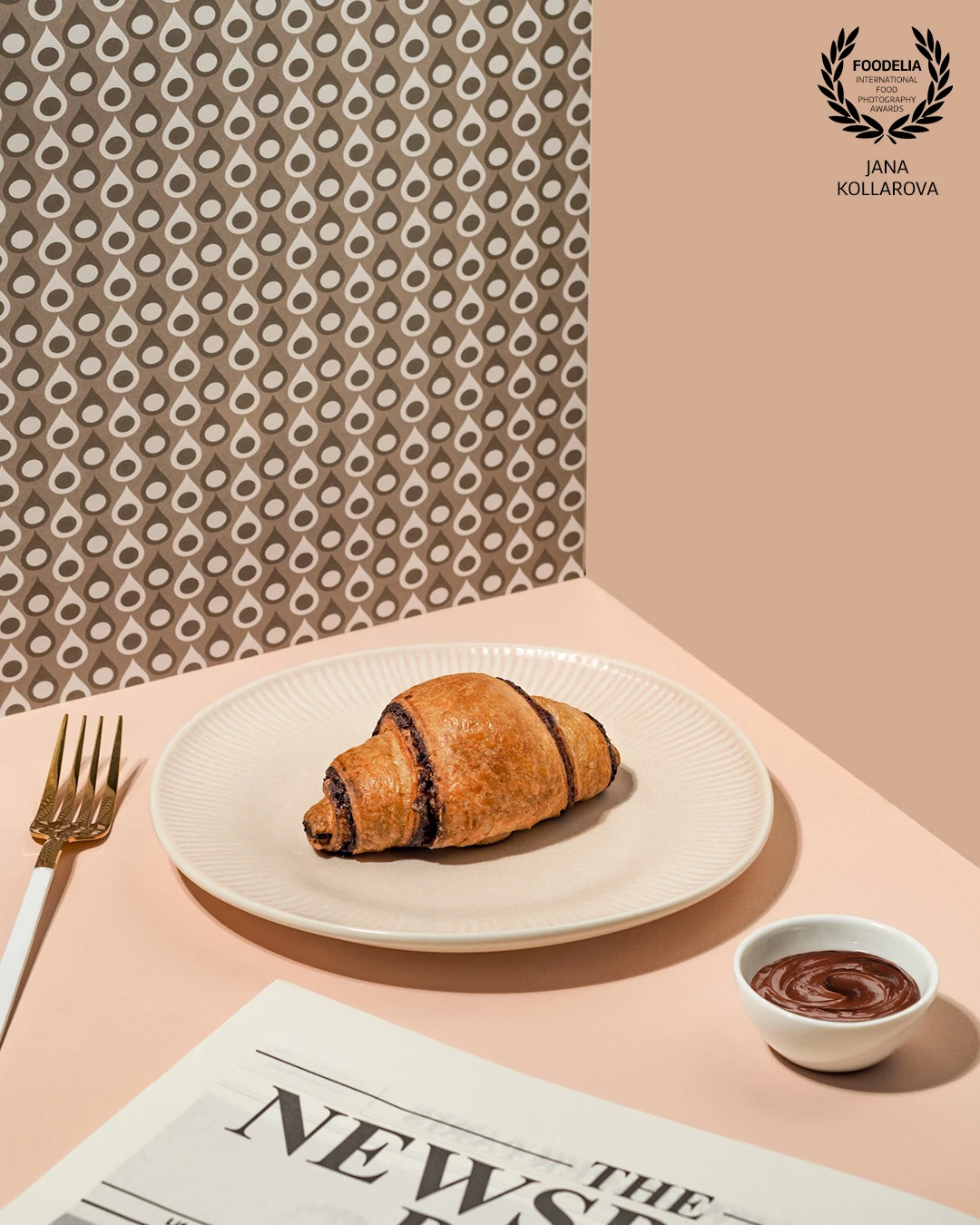 Minimalist breakfast scene with a chocolate croissant on a neutral plate, soft pastel tones, and clean geometric styling. Subtle shadows highlight the flaky texture and warm, inviting look of the pastry.