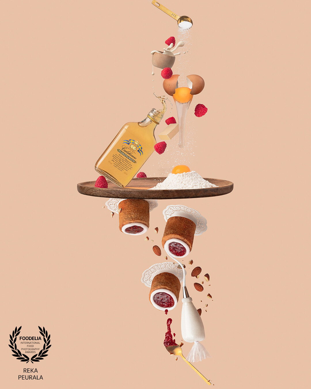A high-concept commercial hero shot built on a striking upside-down, two-plane composition that invites the viewer to pause, tilt, and explore. The featured @hartwall1836 product is the key ingredient of the traditional Runeberg cake. The packaging is woven into the narrative with confidence, honouring both heritage and innovation through dynamic visual storytelling. The unique vision and complex technical execution elevate the product’s role from ingredient to integral muse, creating an image with the pure intention to inspire the viewer while making the brand proud.