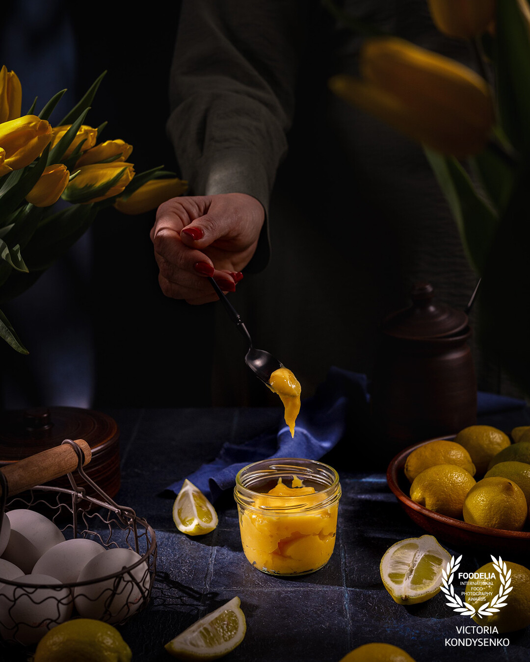 Person taking scooping bright yellow lemon curd from a glass jar amid whole and sliced lemons, eggs in a basket and vibrant yellow tulips in a moody, rustic kitchen still life