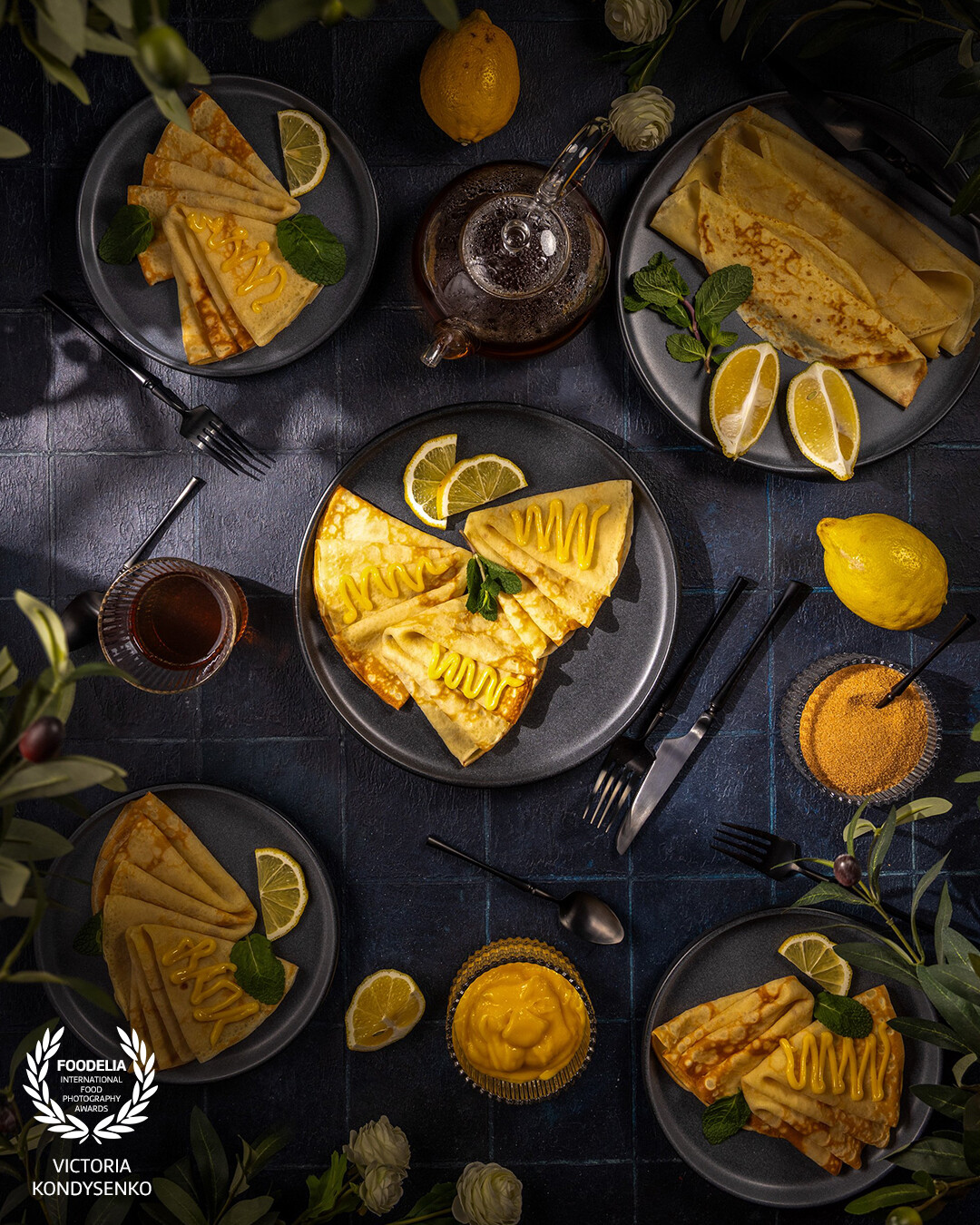 Delicious crepes folded on plates, drizzled with bright yellow lemon curd and garnished with fresh mint, served with lemon slices, a teapot of tea, and dark sugar, creating a festive dessert spread