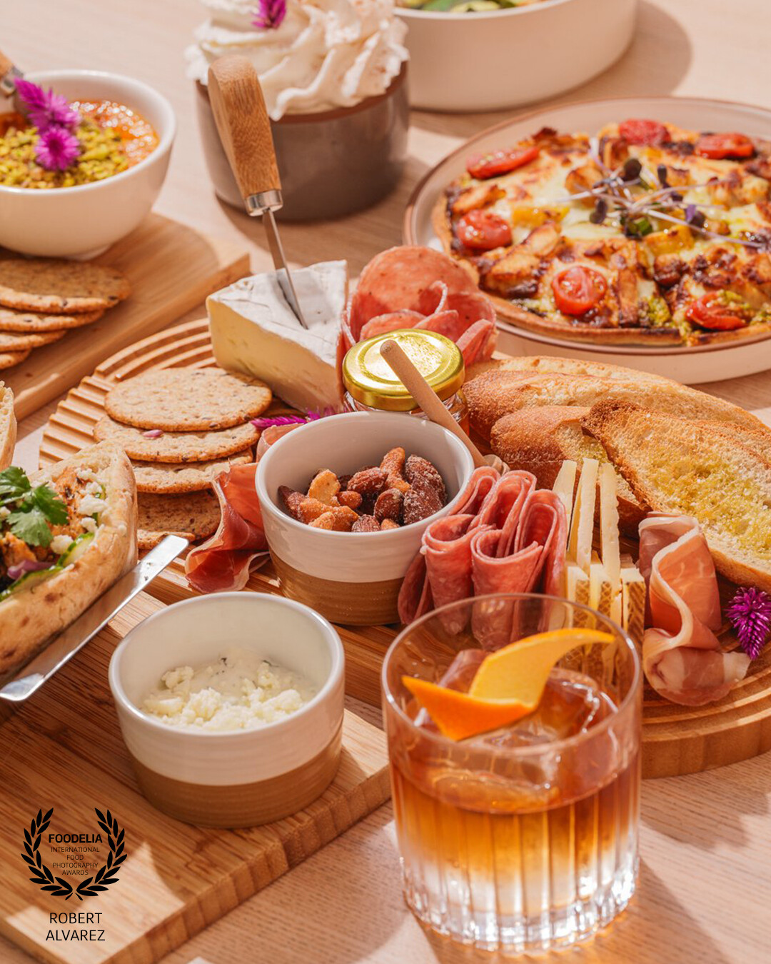 This image at Hiedra Cocktail Lounge plays with contrast in a subtle way. It was shot using hard lighting to create defined highlights and crisp texture across the charcuterie, cocktail glass, and wood surfaces. The directional light adds shape and dimension, making the edges pop and giving the scene structure.