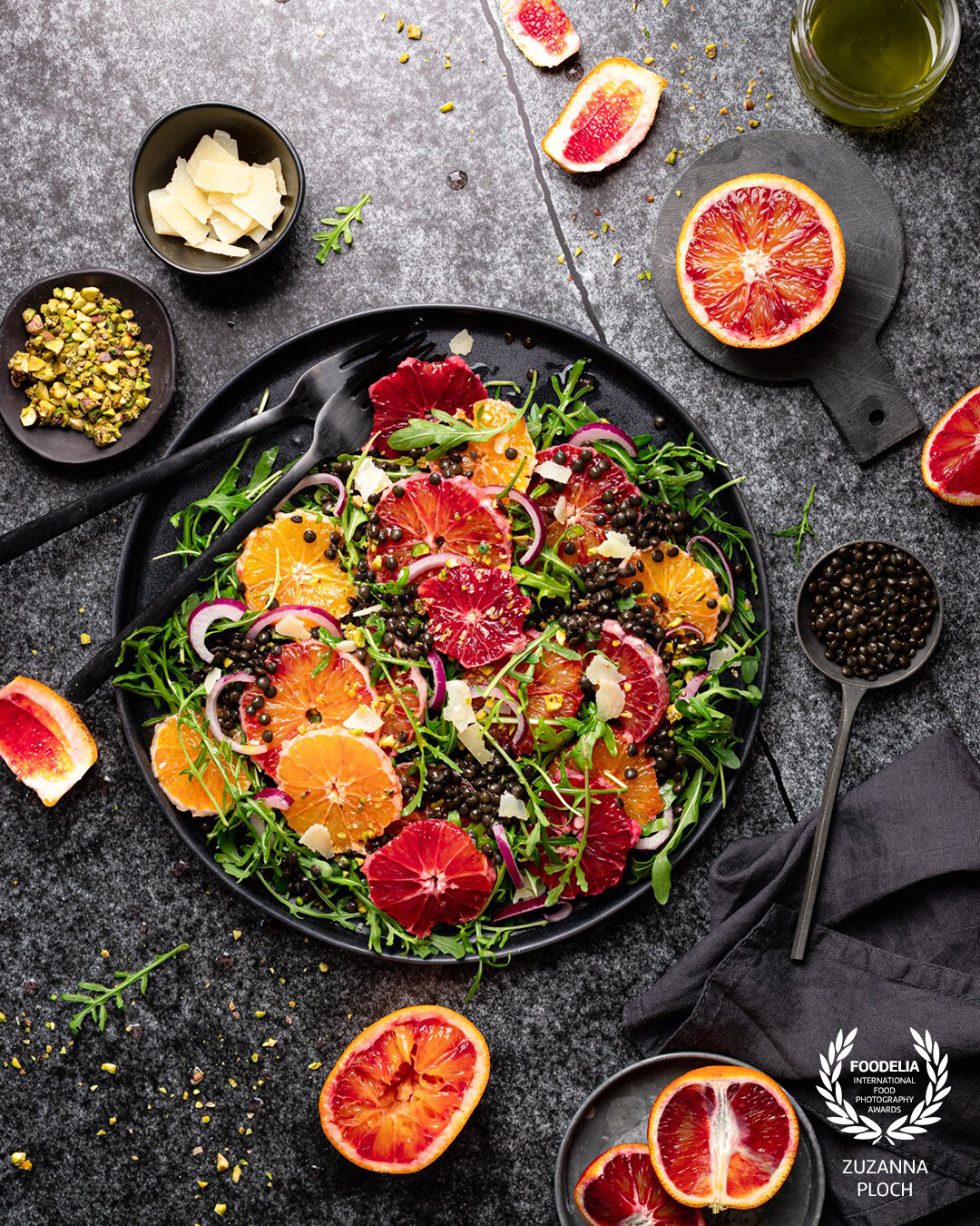 Winter jewel salad. Celebrating the vibrant beauty of winter citrus. The precise arrangement of crimson blood oranges, dark beluga lentils, and fresh greens turns a simple salad into a stunning, edible mosaic.