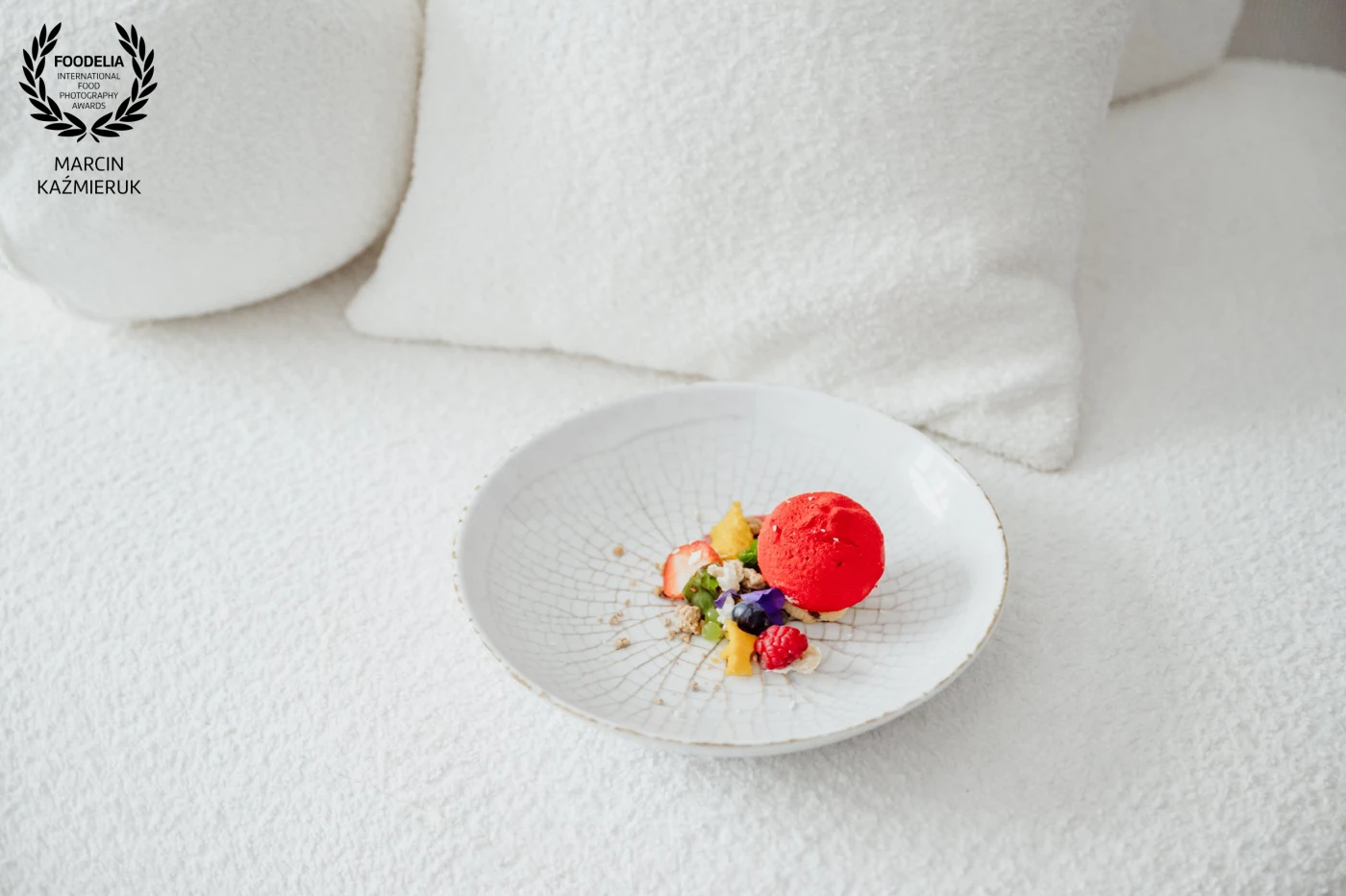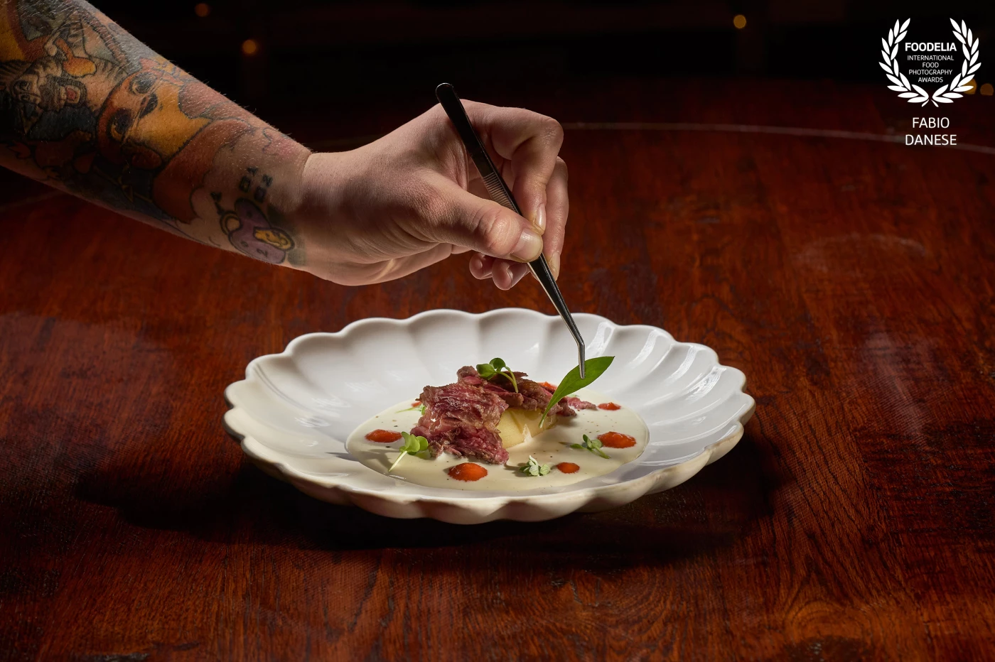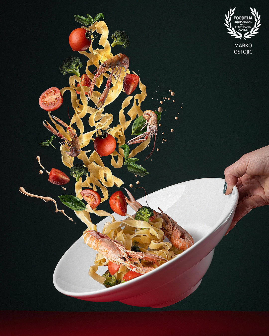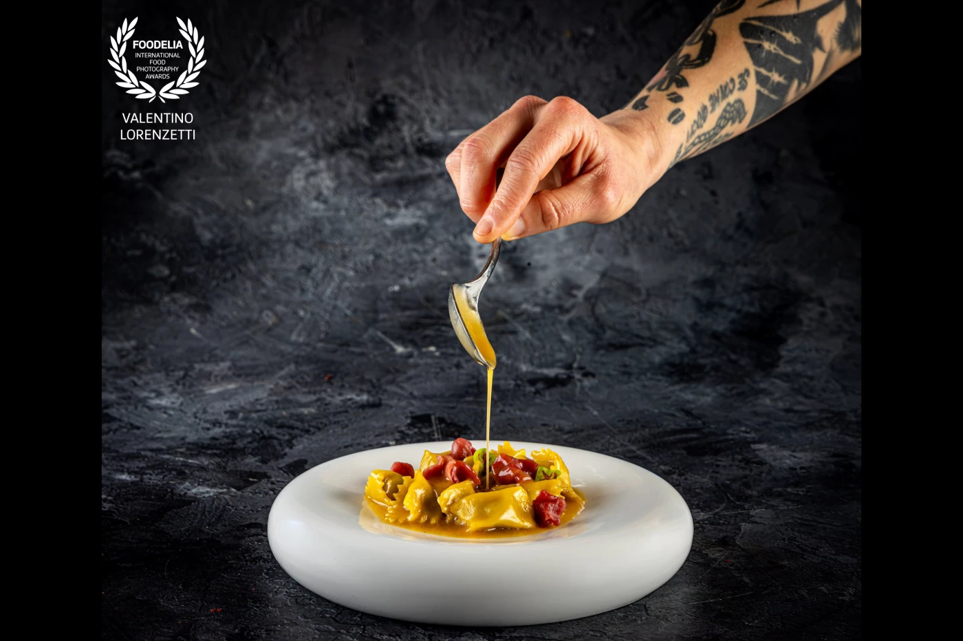 The goal was to shape a warm yet slightly mysterious atmosphere, with the light carefully directed to emphasize the hand and the key elements of the dish, enhancing both texture and depth.