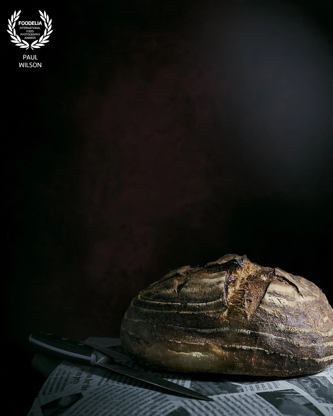 A rustic loaf sits in quiet shadow, its cracked, blistered crust catching a soft, directional light. The low-key setup emphasizes texture and contrast, turning the bread into something almost sculptural. A knife and scattered newspaper add a subtle, everyday narrative, while the dark background keeps the focus on mood and form.
