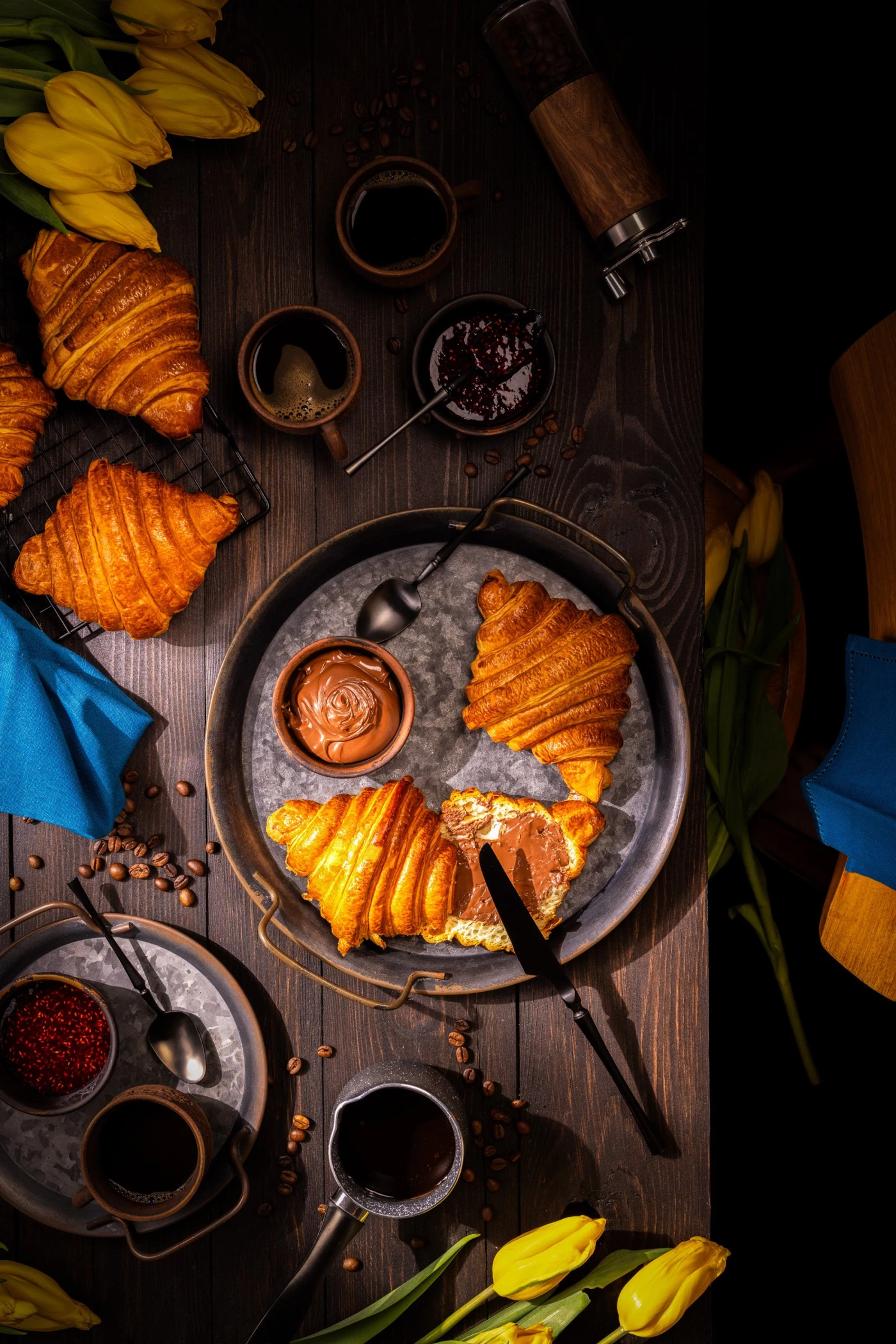 Freshly baked croissants displaying a flaky texture with coffee, chocolate hazelnut spread, and berry jam offering a delicious and inviting breakfast experience on a dark wooden table with tulips