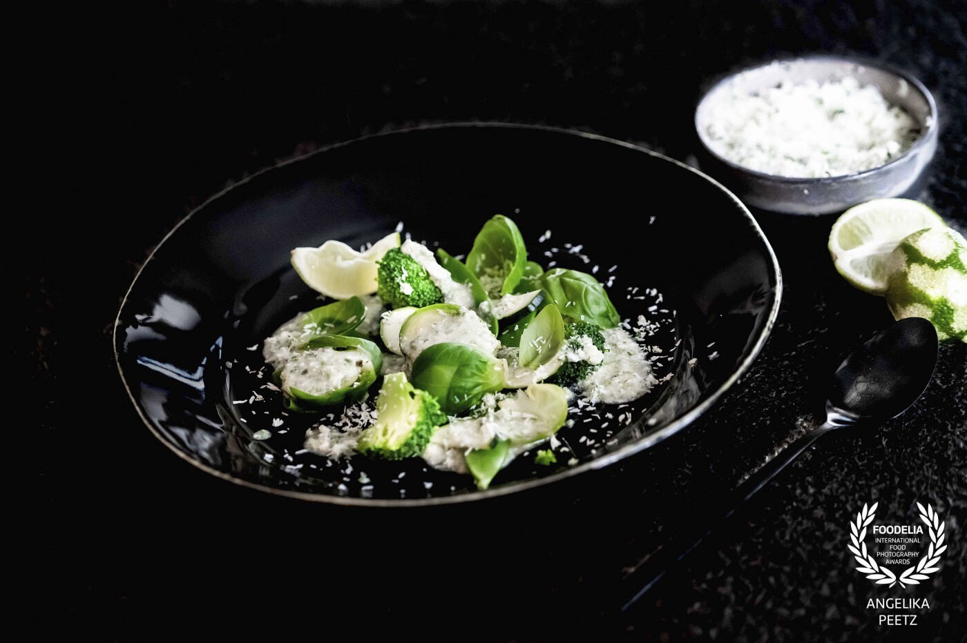 Modern diet needs us to eat light but one is used to flavor profiles they grew up eating in their culture. Why not a soup inspired by staple veggie stirfry made at every home? This is a cauliflower soup with fresh mint and green peas and a mustard oil dressing inspired by the traditional Indian gobi matar stir-fry sabzi. Styling inspired by colors of spring as bright and airy with blue skies and sunny yellow and greenery in this picture.