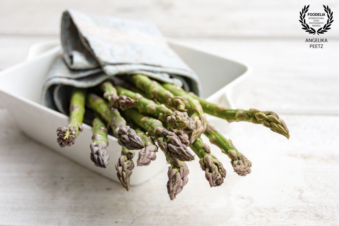 Spring is here. I made a quick salad with asparagus and strawberries, the perfect combination in color and on the plate.