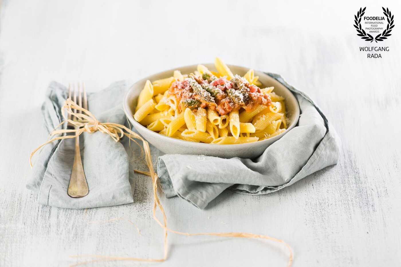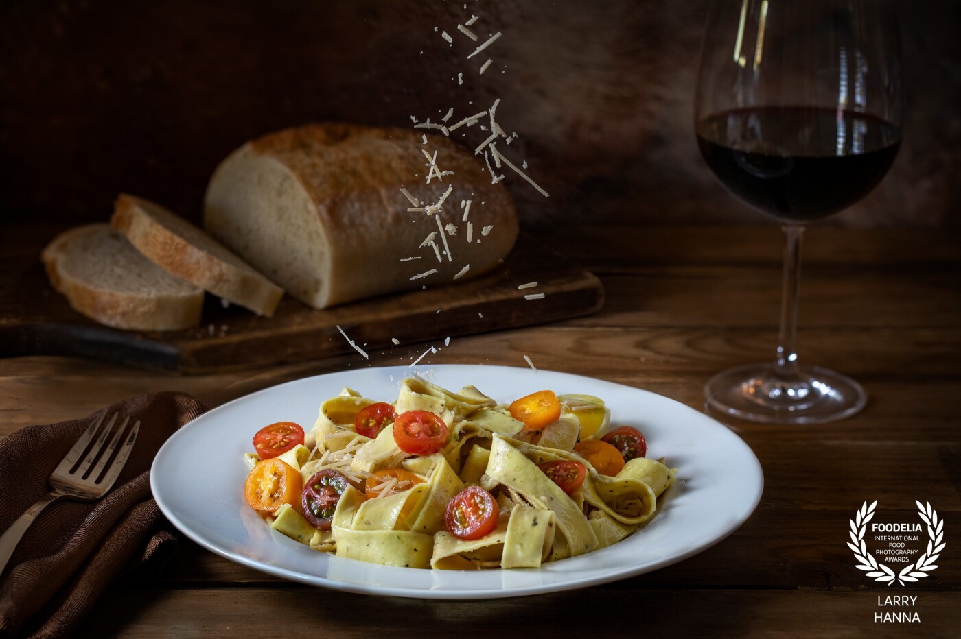 A simple but delicious pasta dish. The pasta was covered with a cream sauce and covered with small cherry tomatoes. Shaved parmesan was sprinkled over the dish. The pasta dish was accompanied by a loaf of Italian bread and a glass of wine, of course,