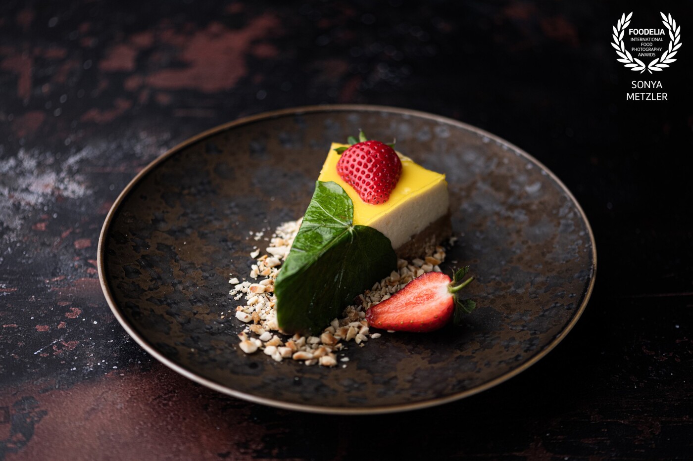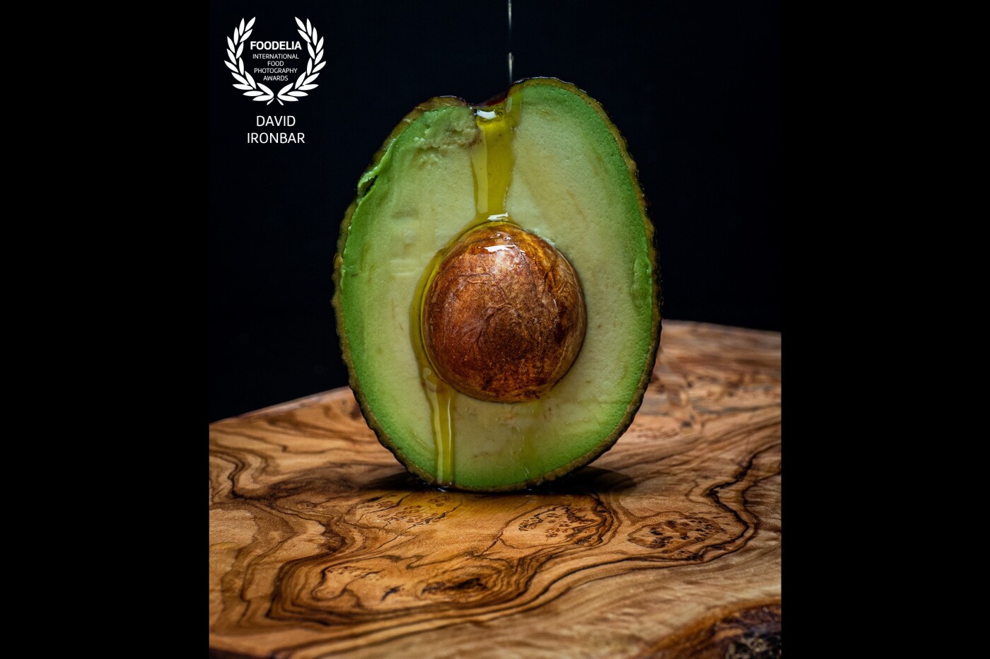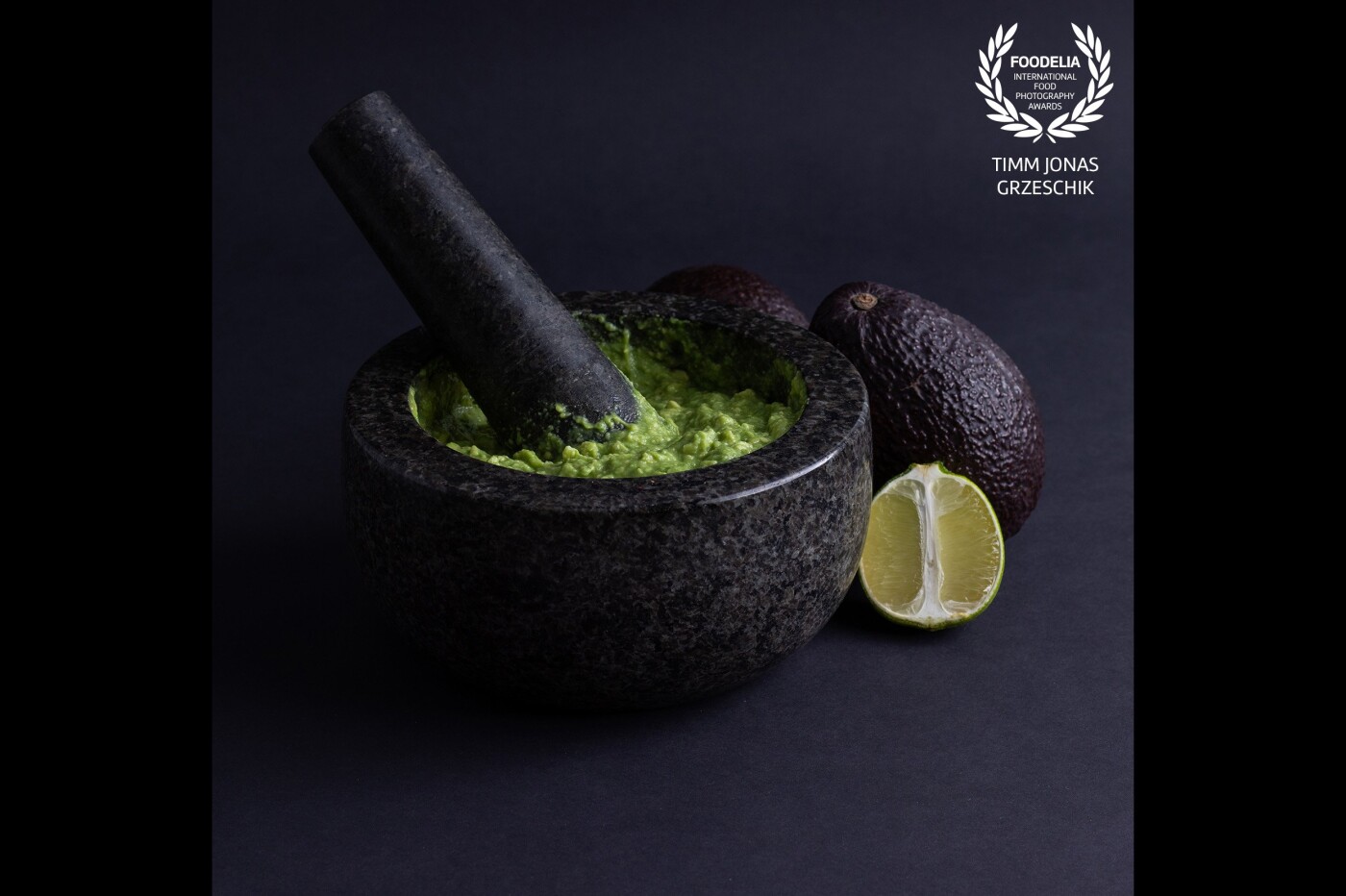 This picture expresses the simplicity and freshness of guacamole. The dark objects and background let the guacamole stand out in this composition and leads the visual focus to it.