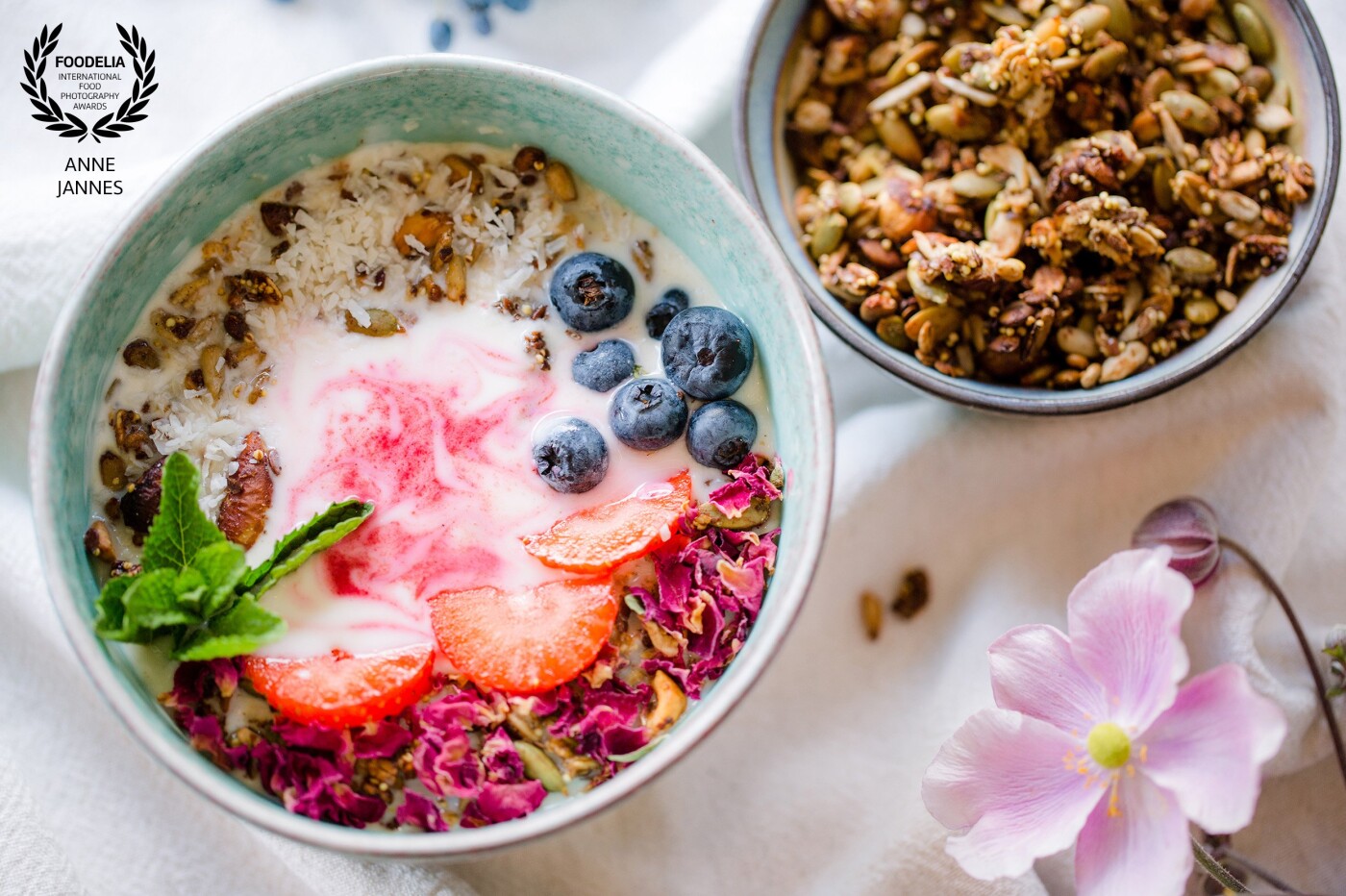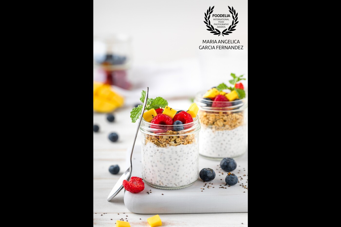 Looking for a healthy, easy breakfast/snack option for my nieces during the quarantine, I prepared these cups of fresh fruit, granola, and vegetable milk with chia seeds. Mostly all my photographs are a reflex of my family home cook.