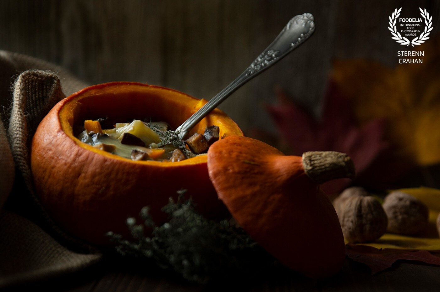 Pumpkin stuffed with mushrooms and cheese and herbs. Captured in natural light. Love colors and light of the fall season.