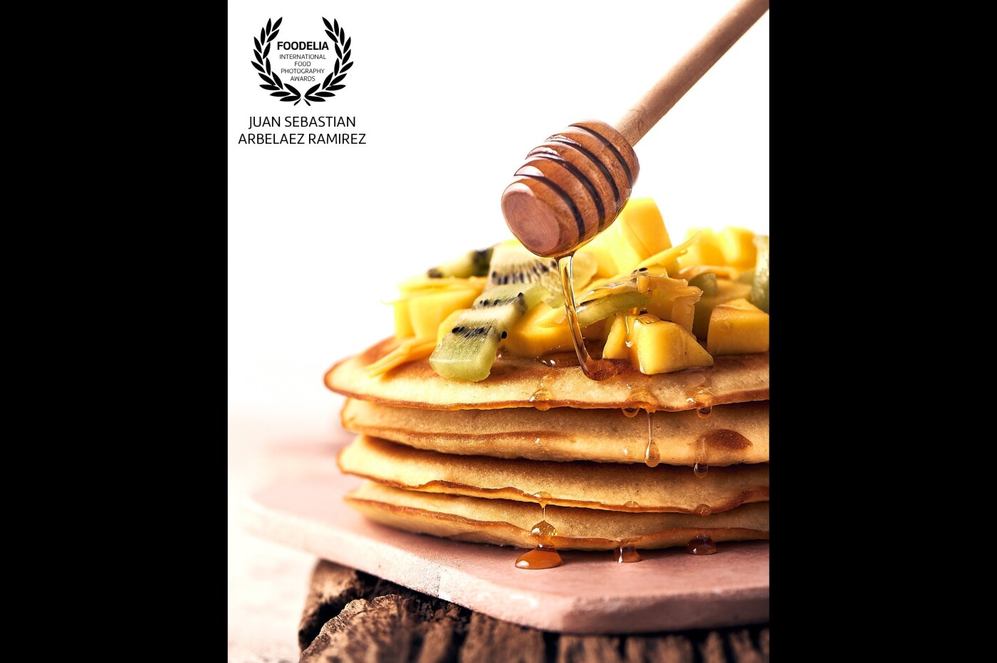 Playing with adjacent colors. The color will always be a great ally when it comes to compose and generate sensations, along with the creation of movement and dynamism produced by dripping honey, achieving a photograph that invites to taste the foods.