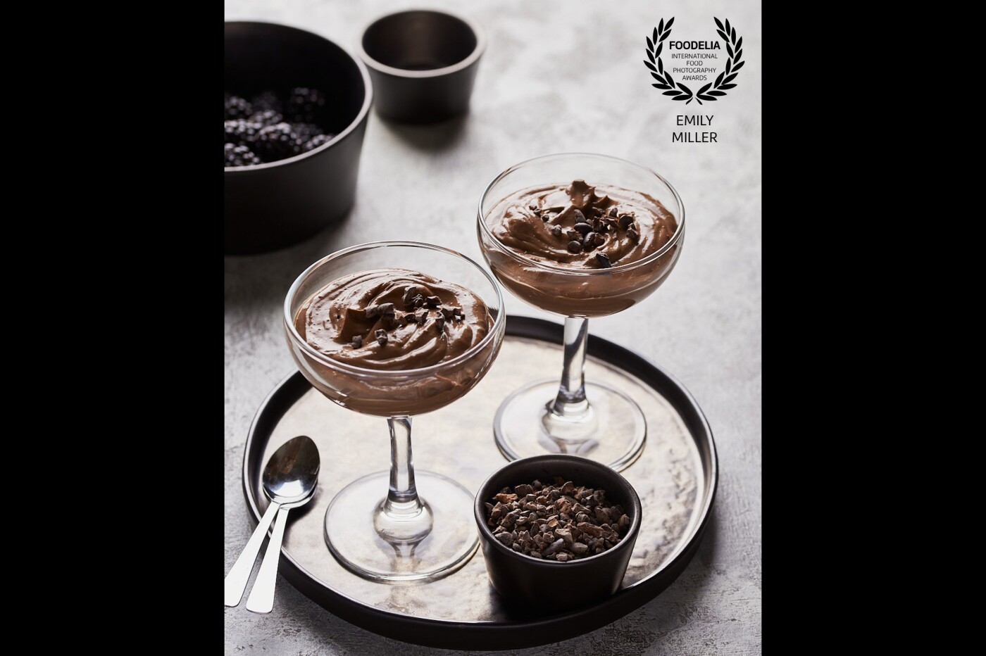These two servings of chocolate peanut butter mousse are topped with cocoa nibs for additional interest and texture. This vegan version of chocolate mousse is based in tofu.