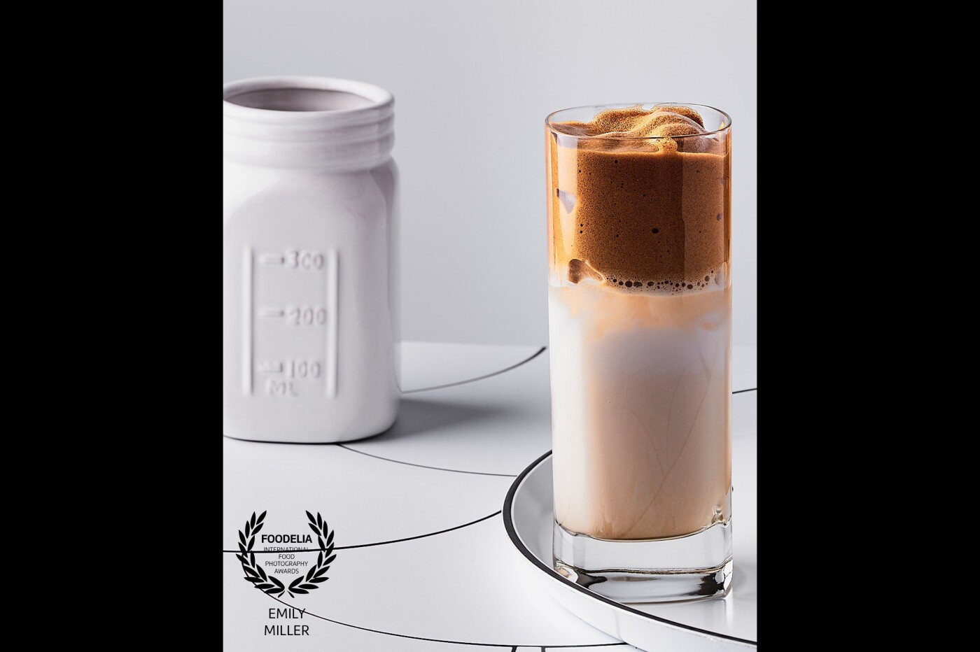 This vegan version is a refreshing take on Dalgona coffee. To make this, I put ice cubes in the glass, added cognac and Grand Marnier, almond milk, and topped it with the coffee. For the frothy coffee, I mixed up hot water with espresso powder and coconut sugar for several minutes.