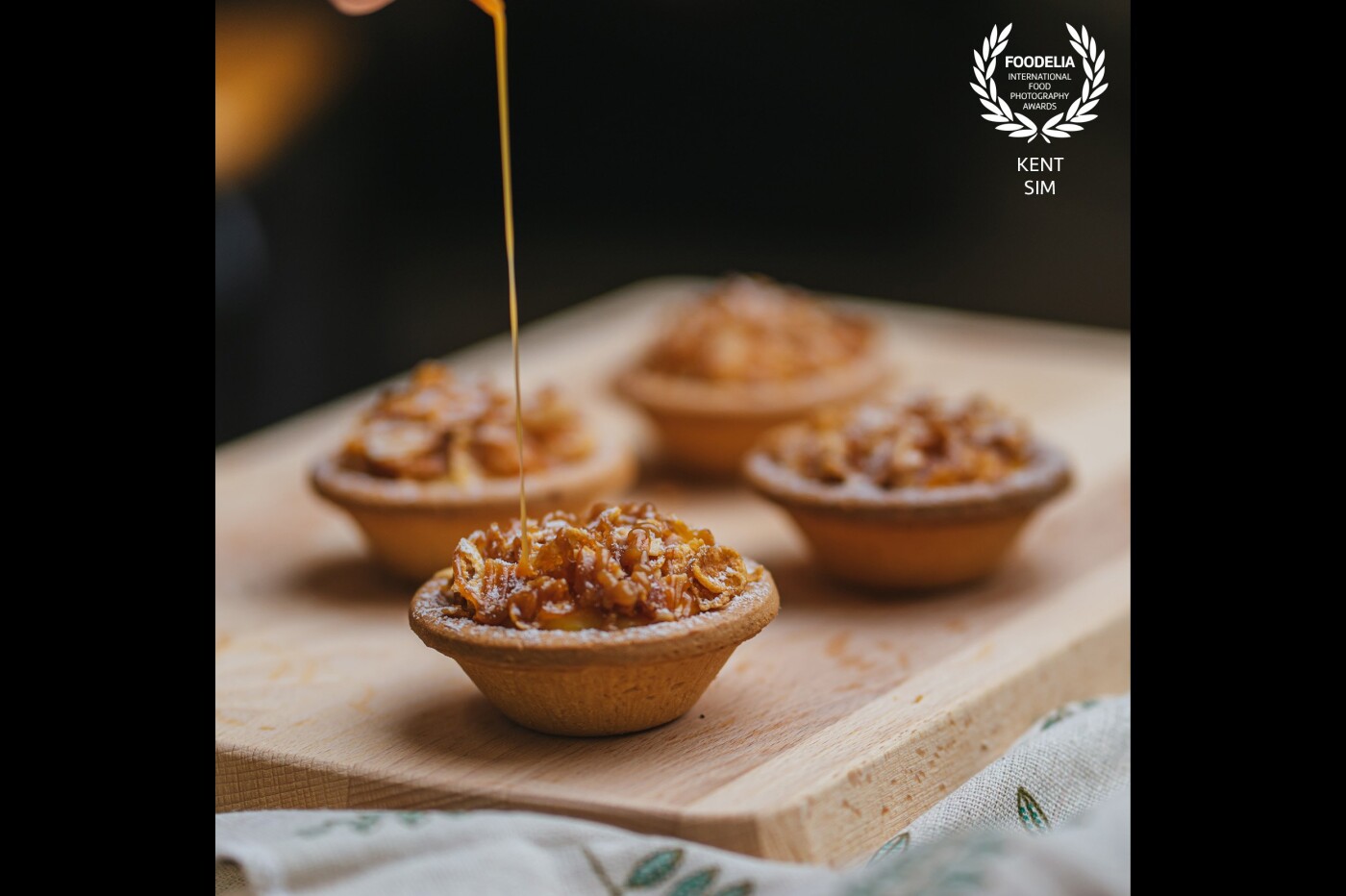 A twist to the typical Hokkaido Baked Cheese Tart. Salted caramel on top of breakfast cereal with pinch of sugar. A bite with a blast of sweet and salty for the Malaysian heavy tastebuds.