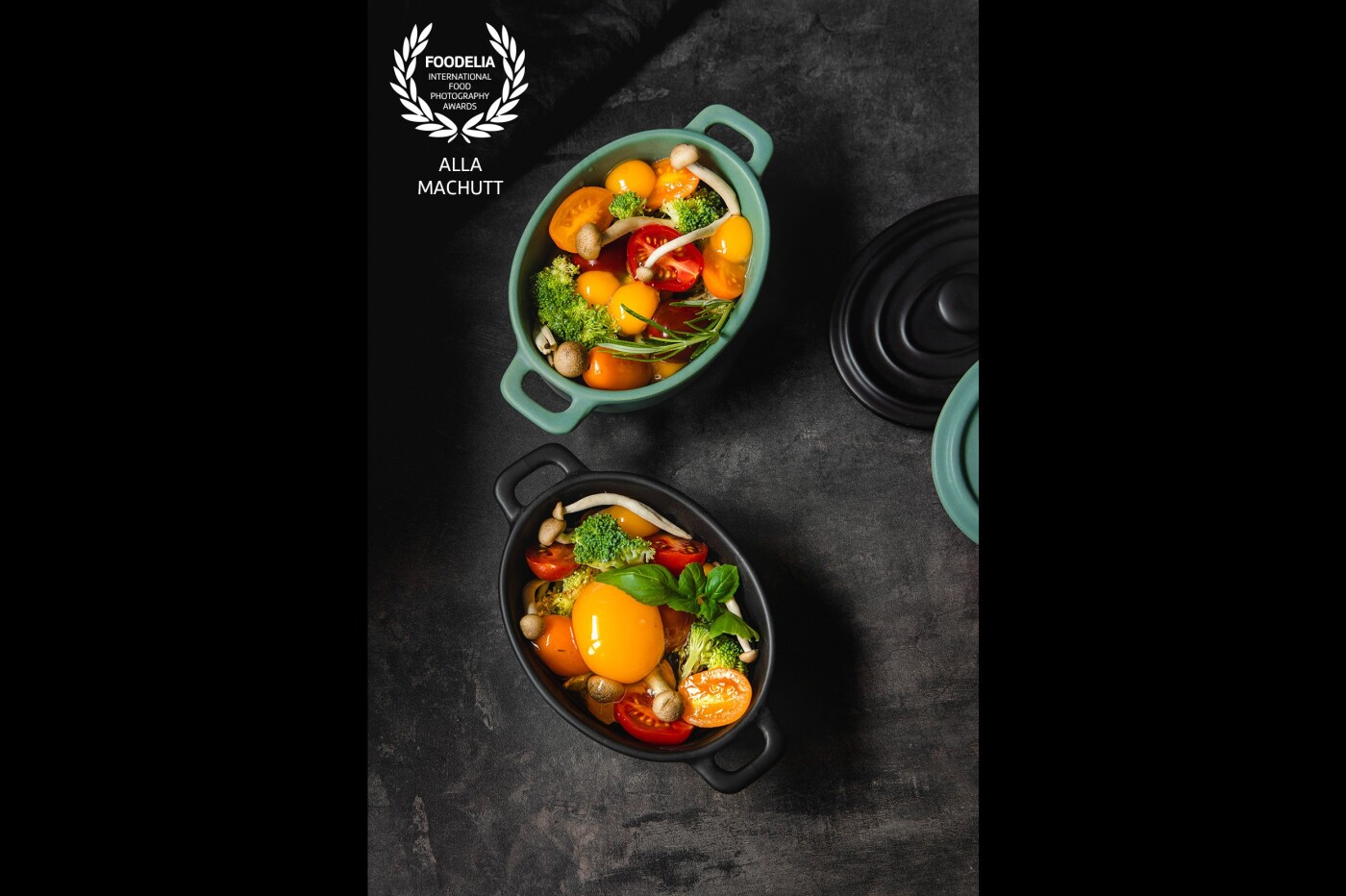 Simple baked eggs with mushrooms, red and yellow tomatoes, and broccoli in the making. I love breakfast ideas that are healthy and easy to make.
