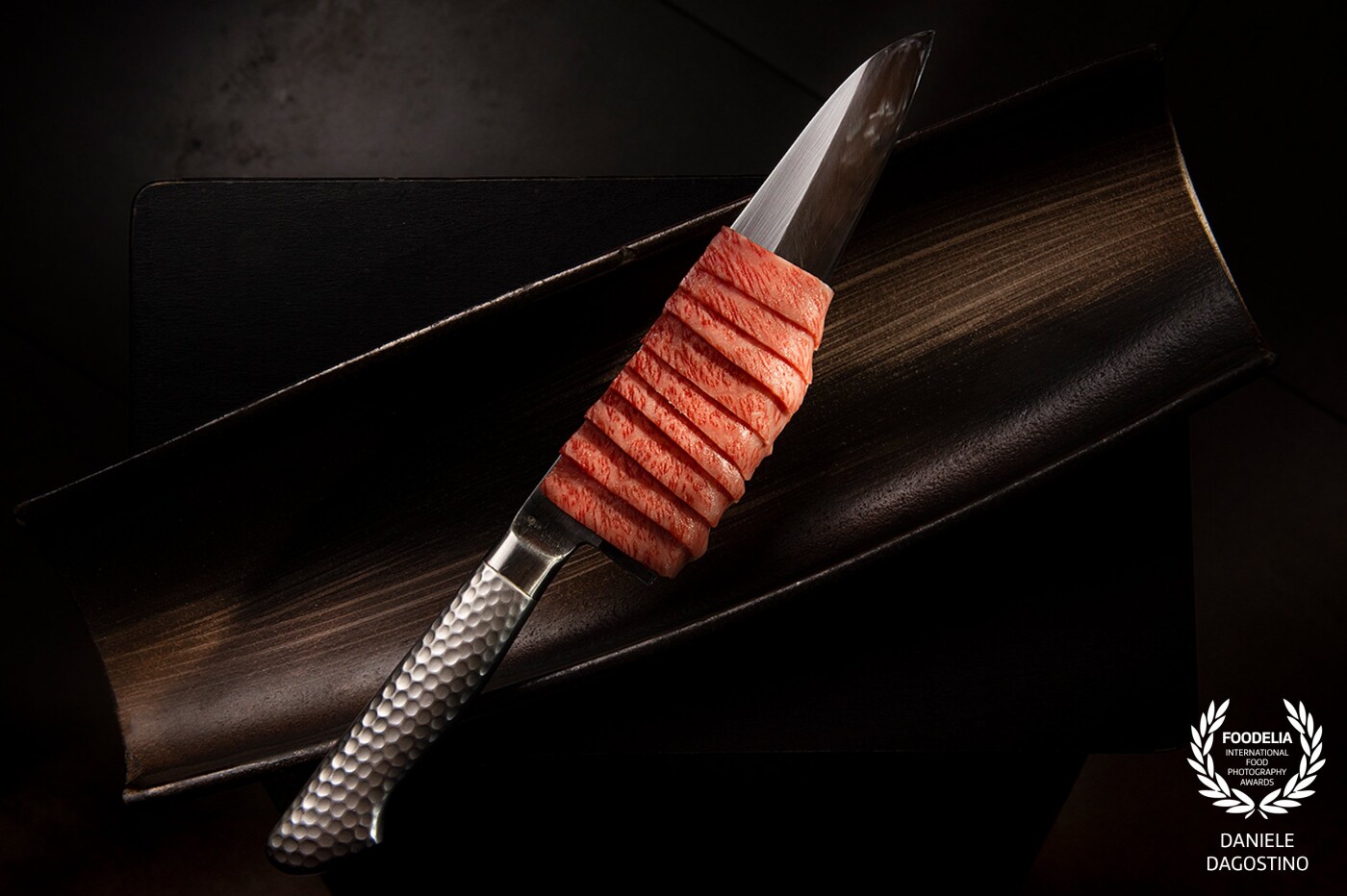 Wagyu is a very fine meat, thinly cut with a very sharp Japanese knife.