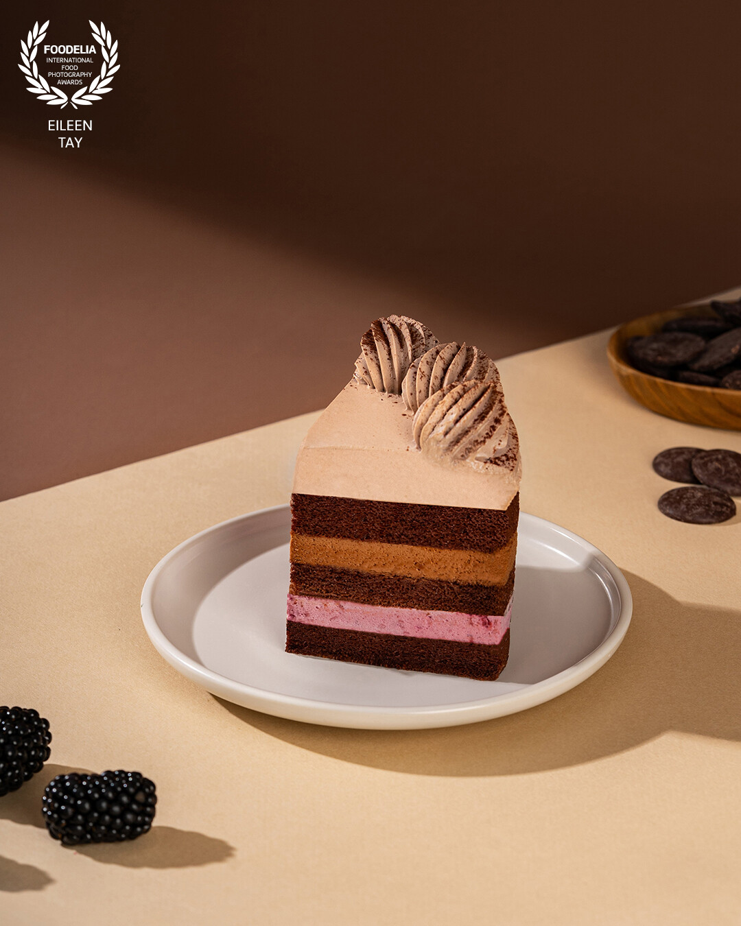 117th CollectionThe hard light forms bold shadows and highlights the cake’s textures, especially the velvety frosting and layered interior, making the dessert appear more dimensional and luxurious.