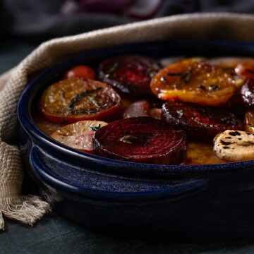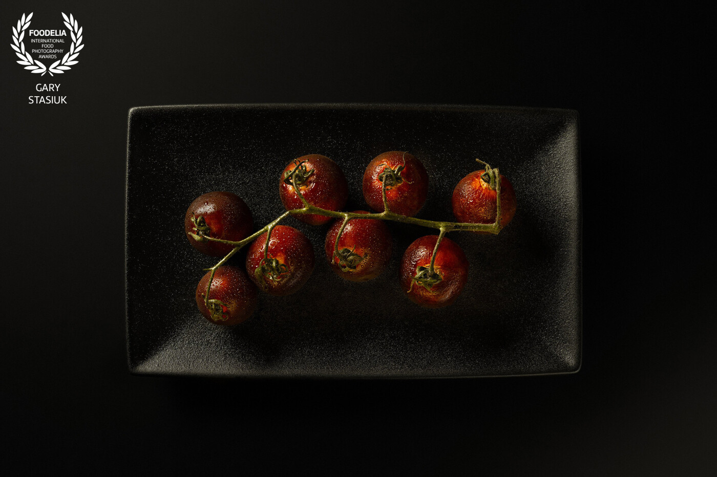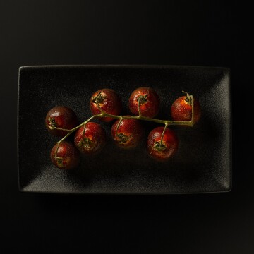 Part of a minimalist series using elegant black plates and cutlery to contrast and highlight the rich luscious colours of the food and ingredients, in this case a sprig of deep red tomatoes.
