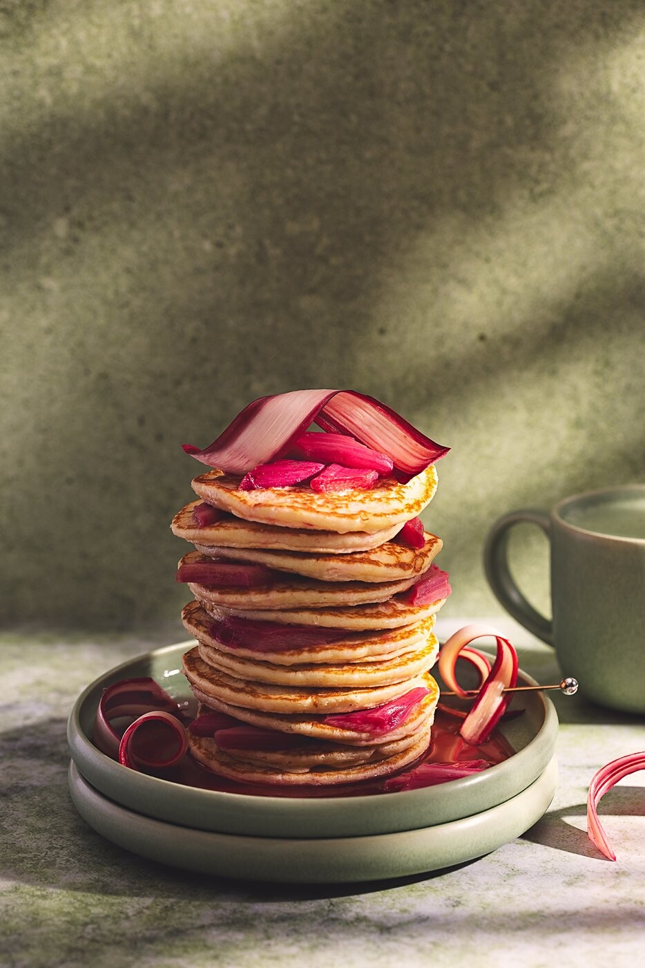 Golden pancakes stacked high, layered with tender rhubarb — a sweet reminder that simple moments can feel indulgent.