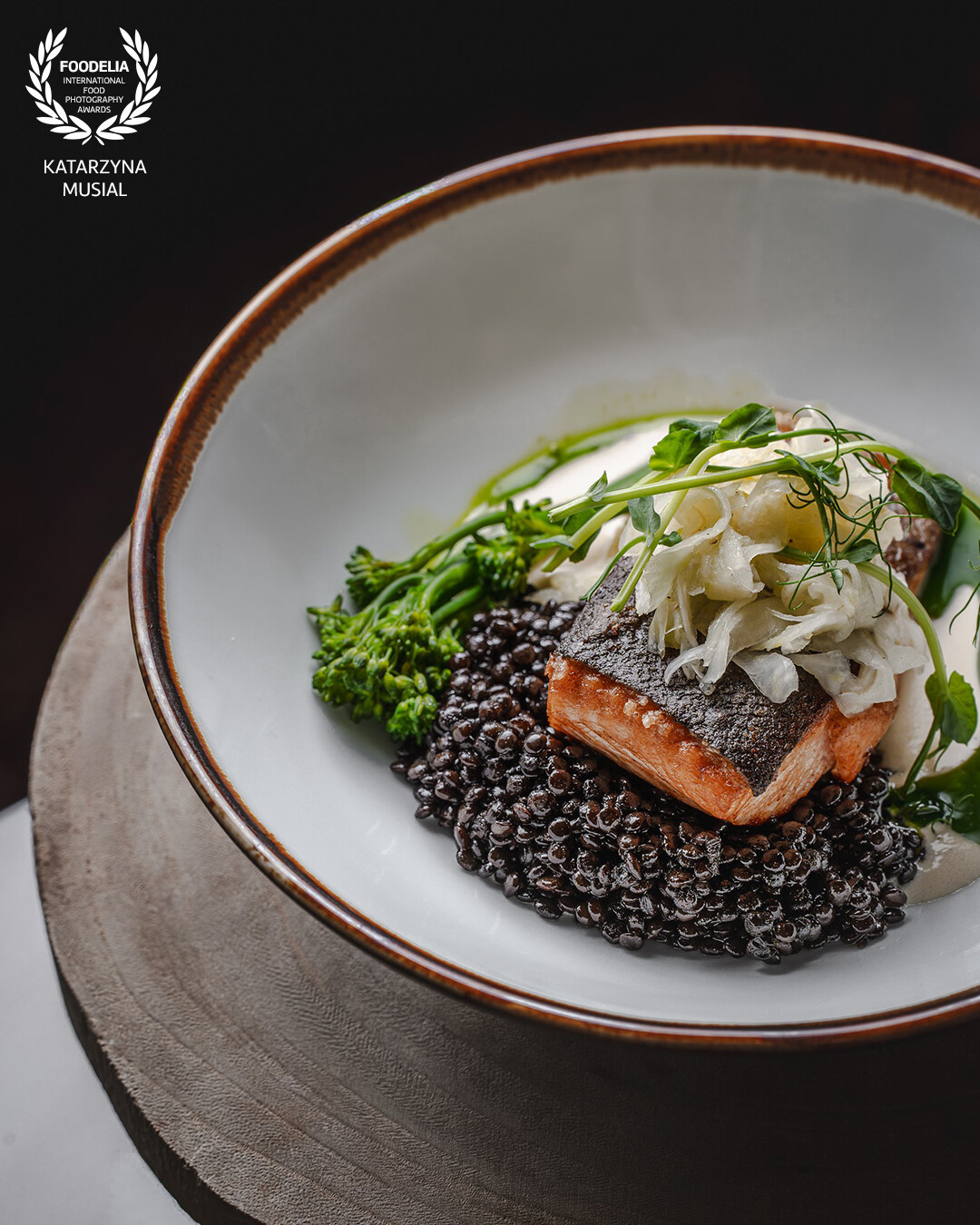 A symphony of textures and flavors — crispy skin salmon resting on velvety beluga lentils, crowned with delicate fennel, broccolini, and microgreens.