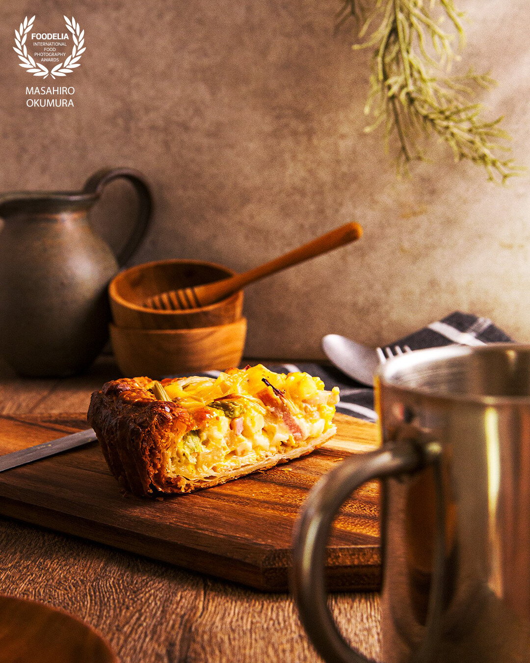Quiche made in a small bakery is gently illuminated by sunlight coming through the window.