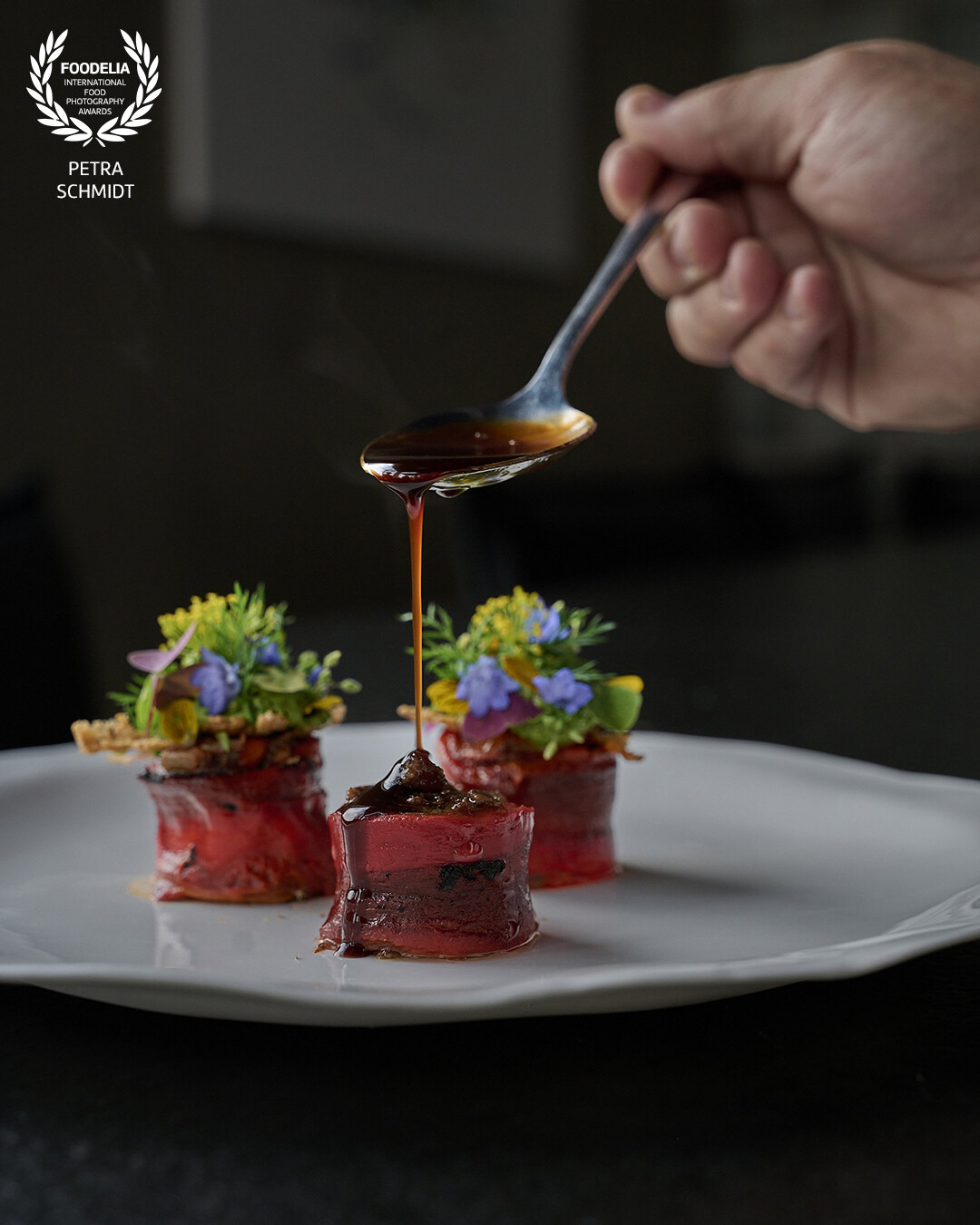A slow-braised Wagyu Bürgermeisterstück, nestled in sweet pointed pepper — crafted by Michelin-starred chef Marcel von Winkelmann and beautifully staged in his restaurant. I had the pleasure of capturing this moment, where depth of flavor meets refined culinary storytelling. A dish that shows how Wagyu from Frankenhöhe transforms simple ingredients into something truly memorable.