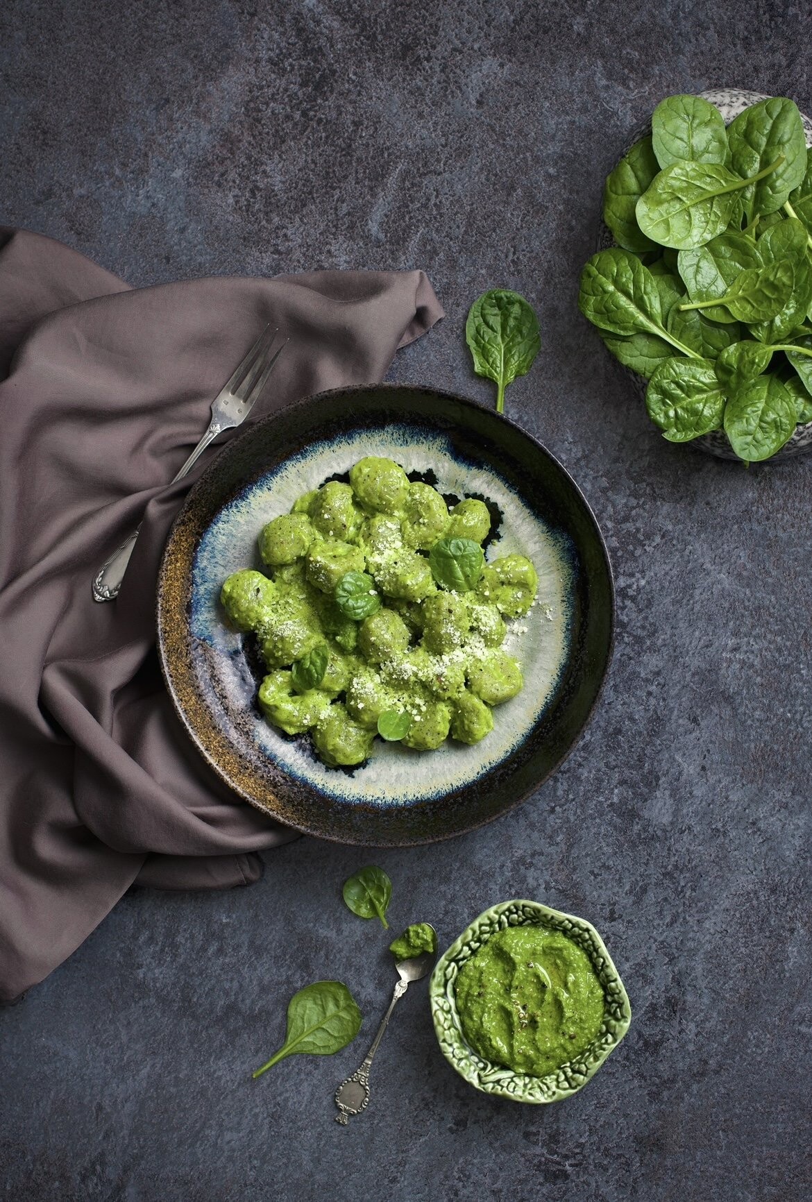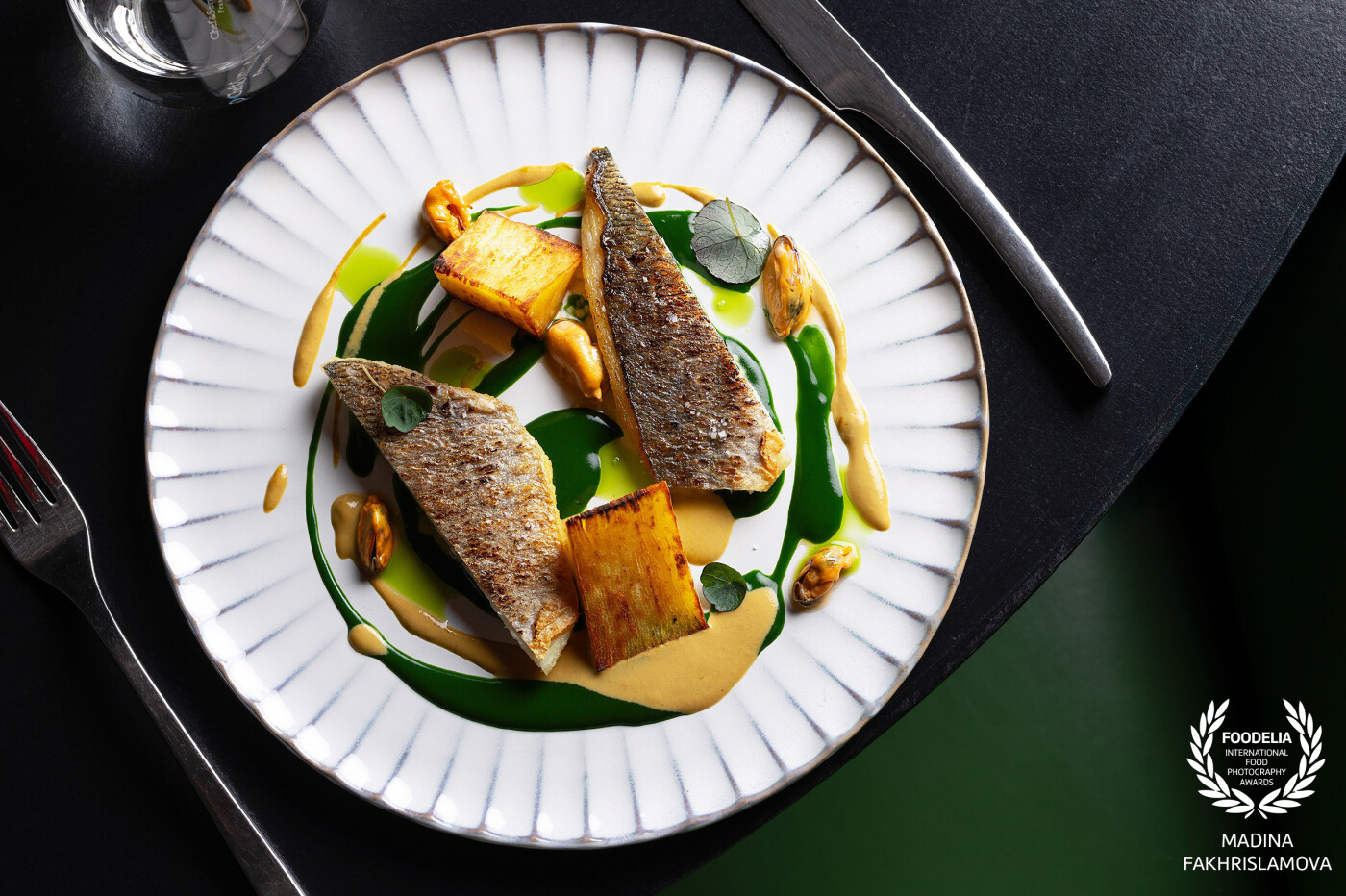 Sea bream, potato mille-feuille, New Zealand spinach coulis, and mussel escabeche.