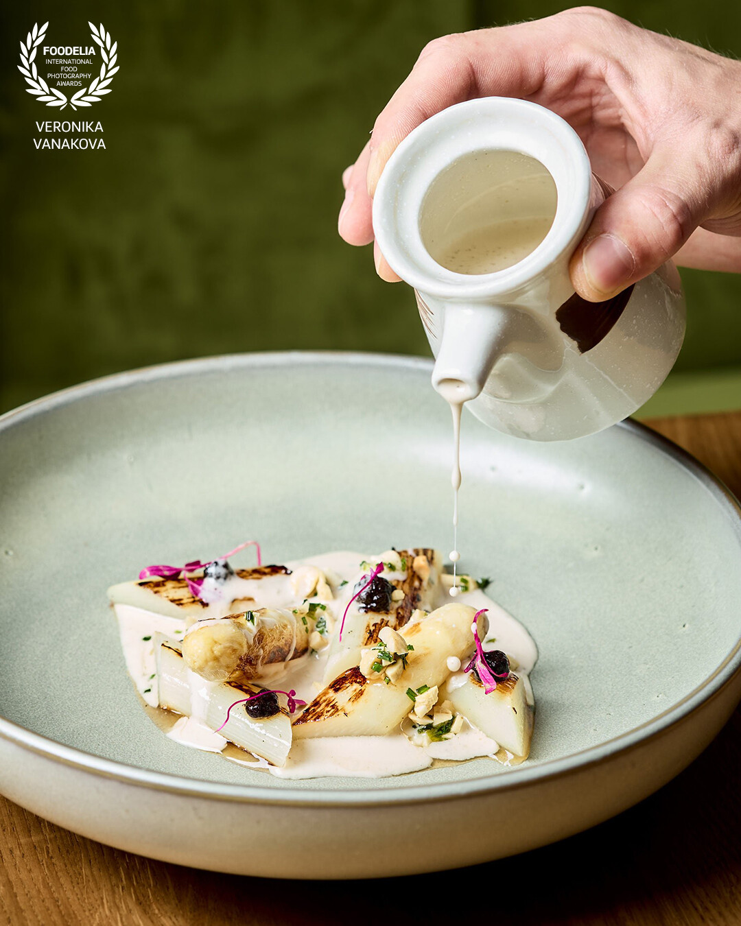 117th CollectionA spring composition from La Trasiega restaurant (@latrasiega): tender white asparagus from Navarra, carefully cooked to preserve its delicate flavor, served with a silky, dairy-free tigernut jus. A minimal yet vibrant celebration of seasonal ingredients.