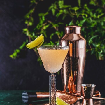 119th CollectionBartender adding a lemon twist garnish to a vibrant red cocktail in a coupe glass, showcasing the art of cocktail making