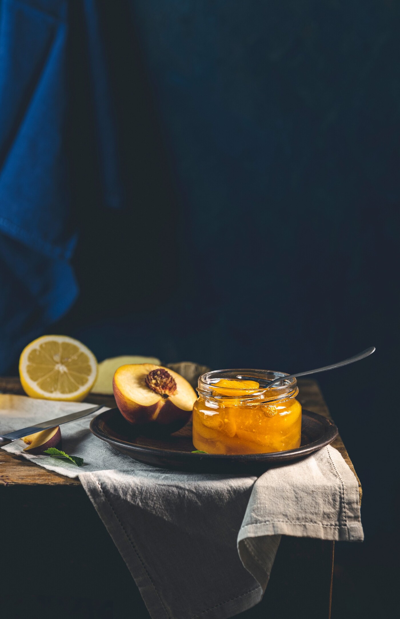 118th CollectionPlates of melon and prosciutto appetizer with feta cheese, basil, lime, and spices, arranged on a dark blue textured surface, creating a vibrant culinary scene